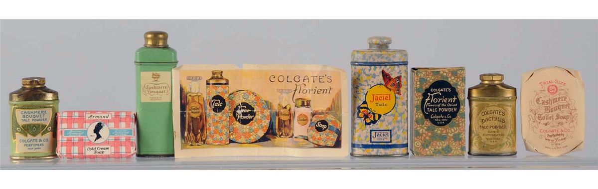 Colgate's Cashmere Bouquet Toilet soap, Colgate's, Florient Talc (original box), Armand Cold Cream Soap, Colgate's Dactyus Talc, Colgate's Cashmere Bouquet Talc, tall Colgate's Cashmere Bouquet Talc, tall Palmolive After Shave Talc. Condition (Excellent P