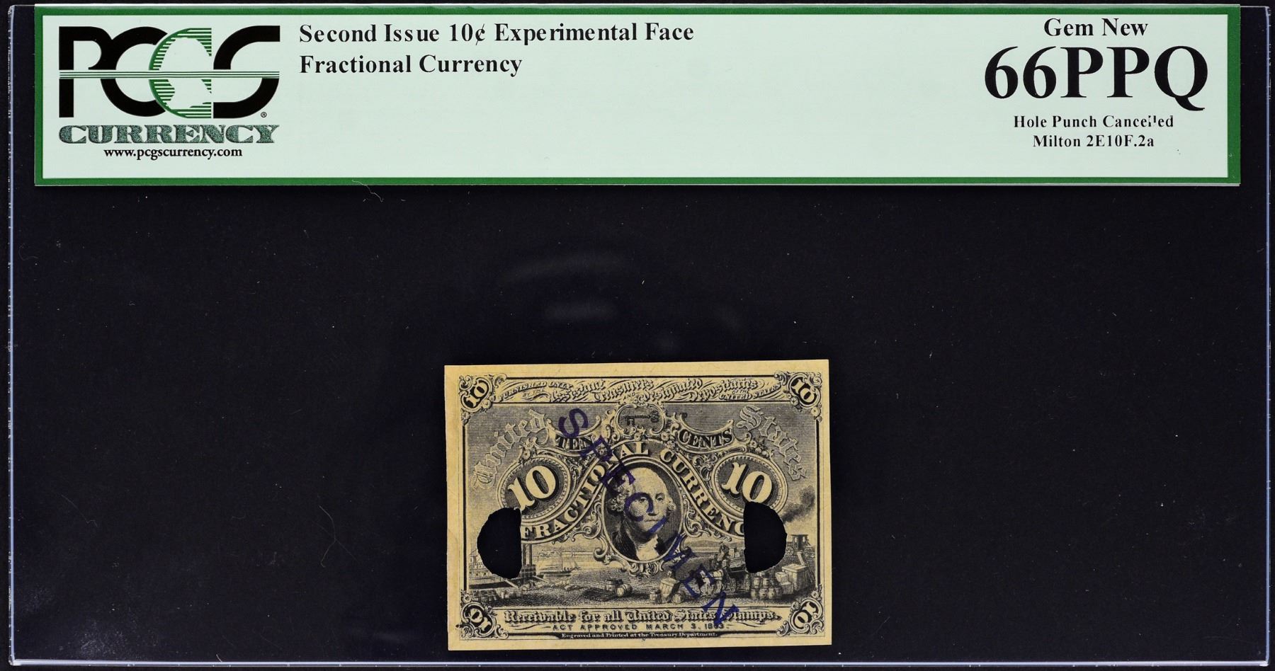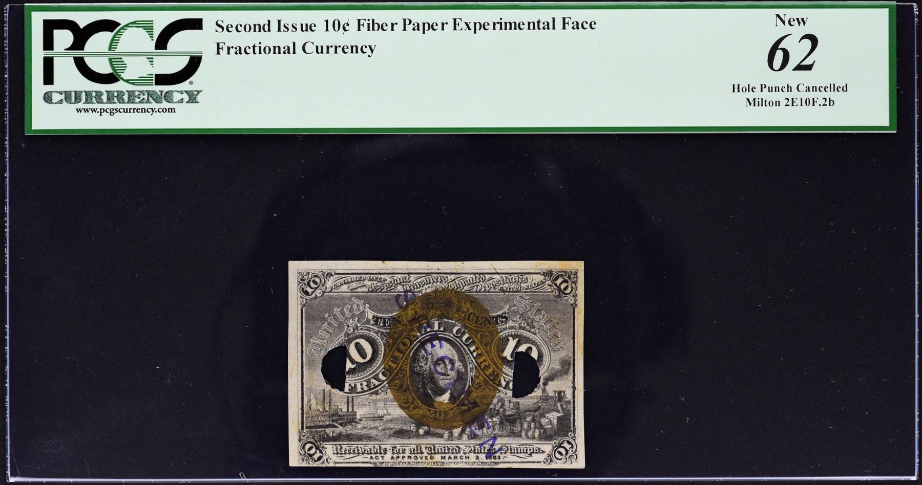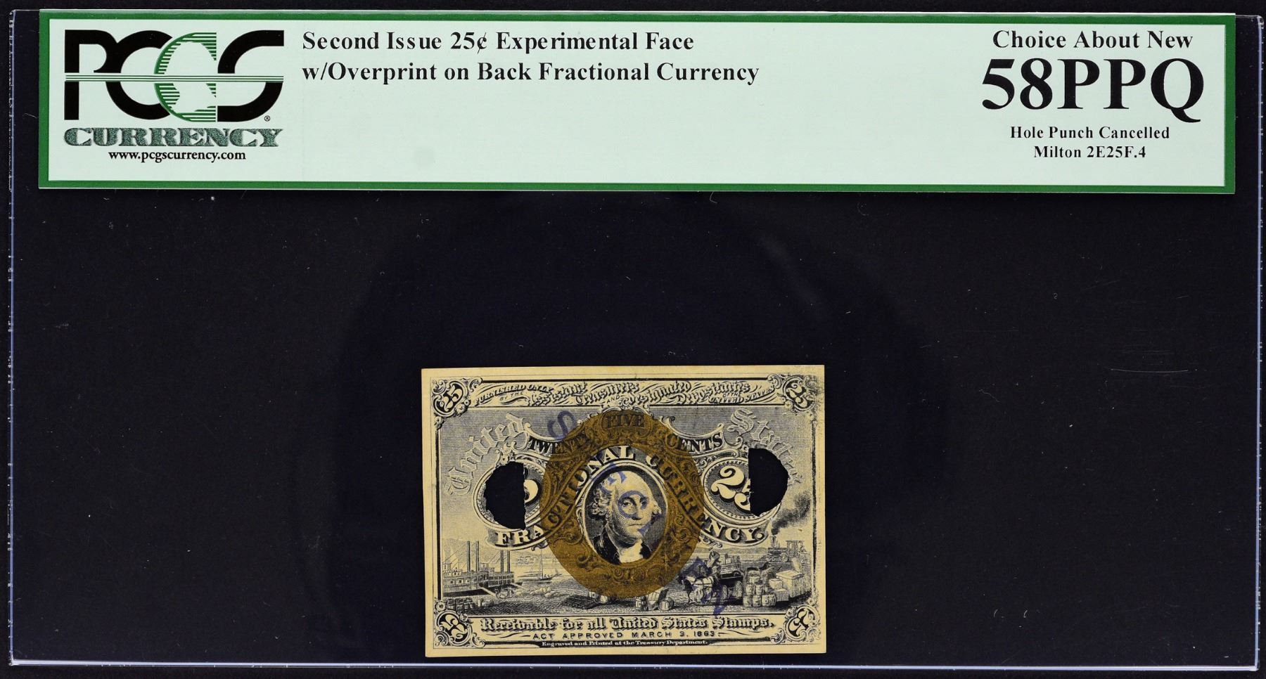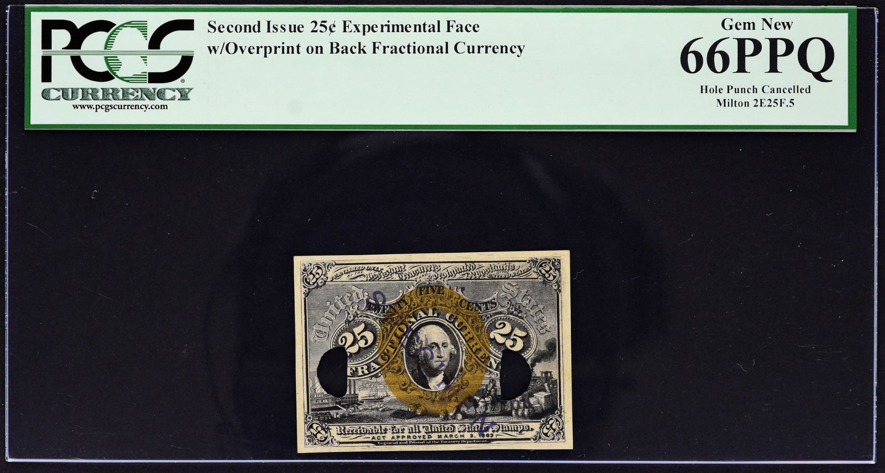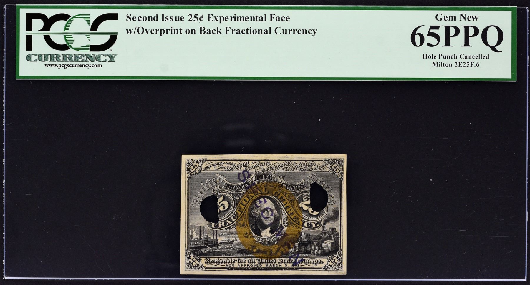 A desirbale lot of these experimental types with the following; Milton 2e10F.2b 10 Cents fiber paper face in New 62 with the comments "Minor Stains."; Milton 2E10F.2a 10 Cents face in Gem New 66 PPQ; Milton 2E25F.3e 25 Cents face in Gem New 65 PPQ; Milton 2E25F.4 25 Cents face in Choice About New 58 PPQ; Milton 2E25F.5 25 Cents face in Gem New 66 PPQ; Milton 2E25F.6 25 Cents face in Gem New 65 PPQ; Milton 2E50f.4 50 Cents face in Choice About New 58 PPQ.