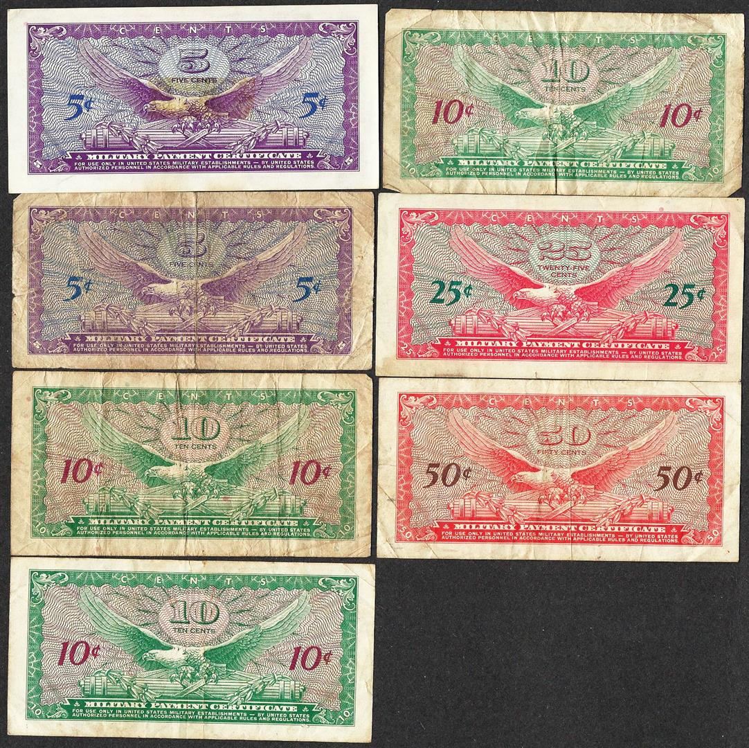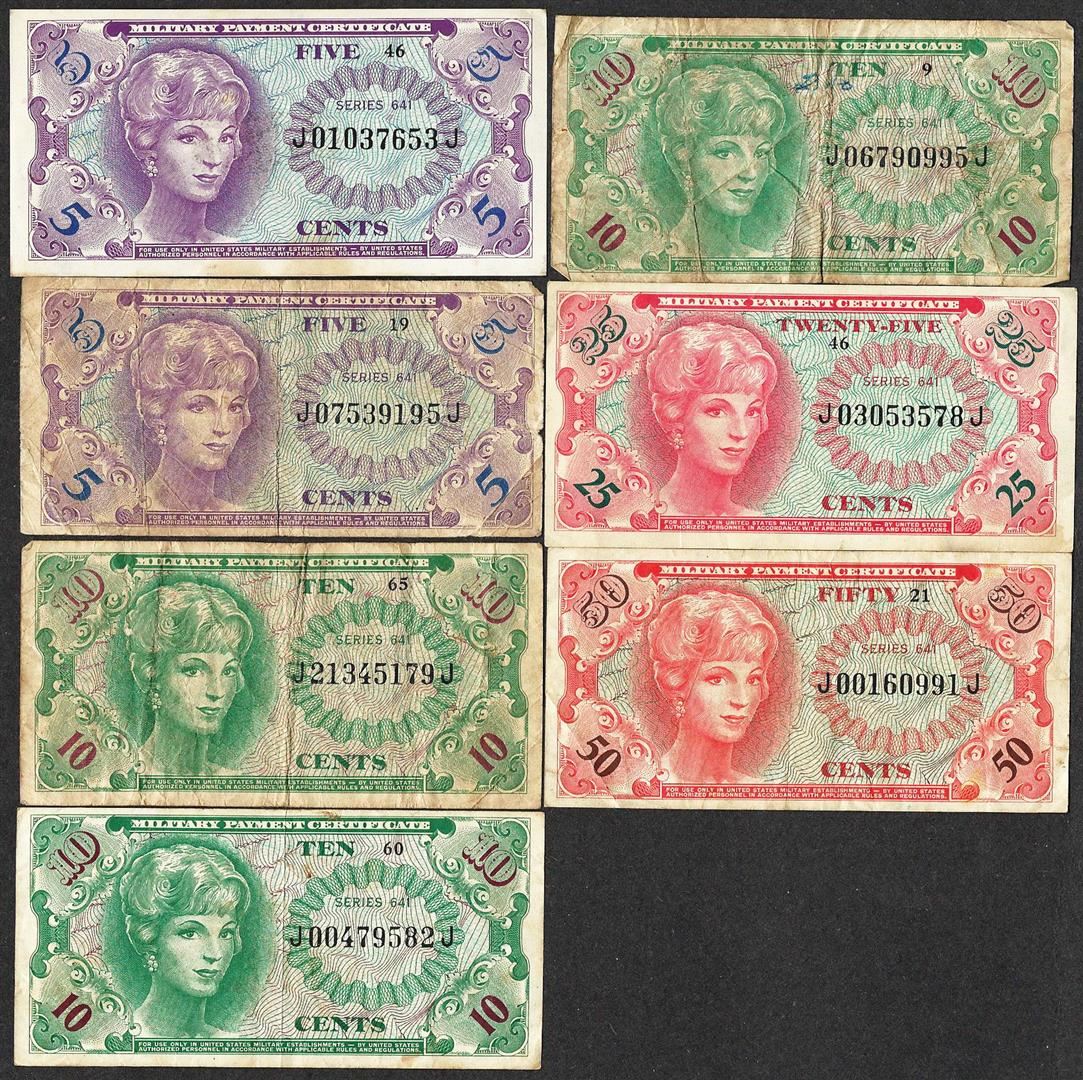 One Lot of (7) Series 641 Military Payment Certificate Notes.
