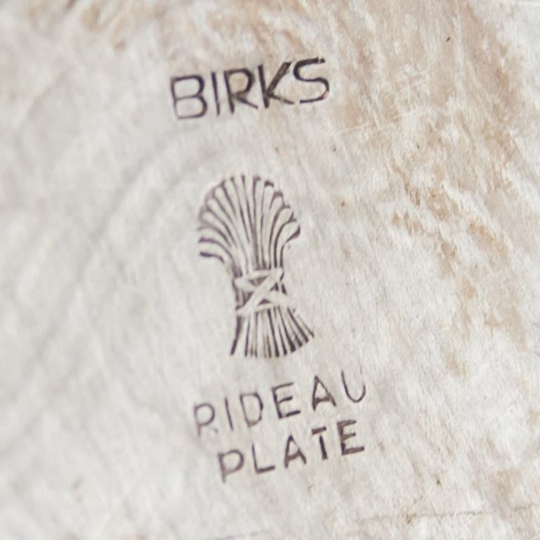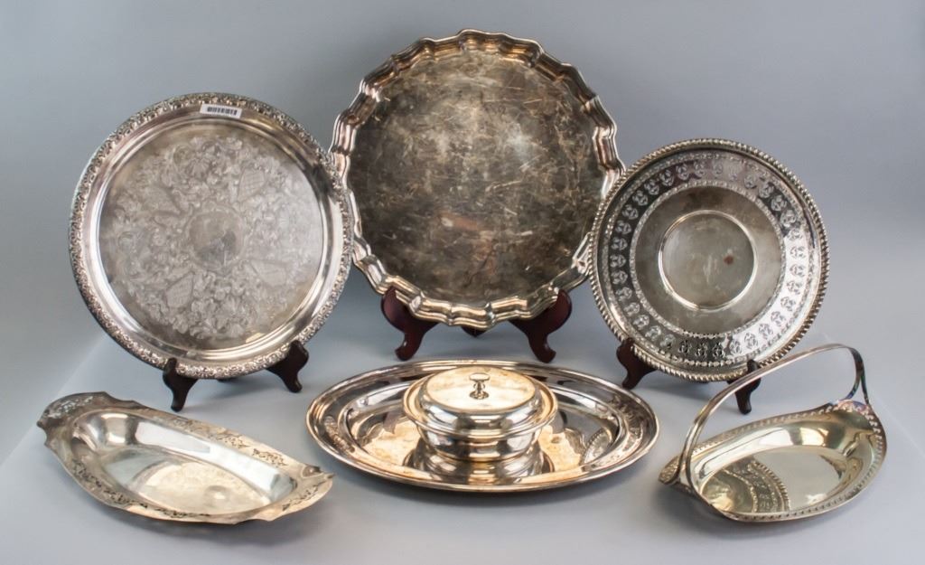 Lot of 7 silver-colored serving trays and dishes. Stamped variously with "BIRKS / Regency Plate", "Birks RIDEAU PLATE / EP BRASS 1047", "HARRISON BROS & HOWSON SHEFFIELD. ENG / ALPHA PLATE EPNS AI 5911", and "BIRKS / EP-NS". 12 x 34 cm. 4 kg..