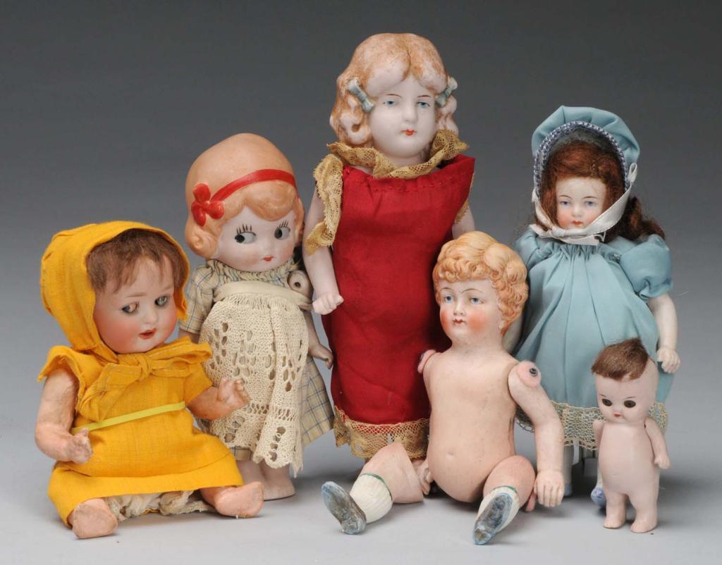 Description Consists of six all-bisque dolls and one small Heubach Koppelsdorf baby on a five-piece composition body. Condition (Fair - Good). Size 9" T.