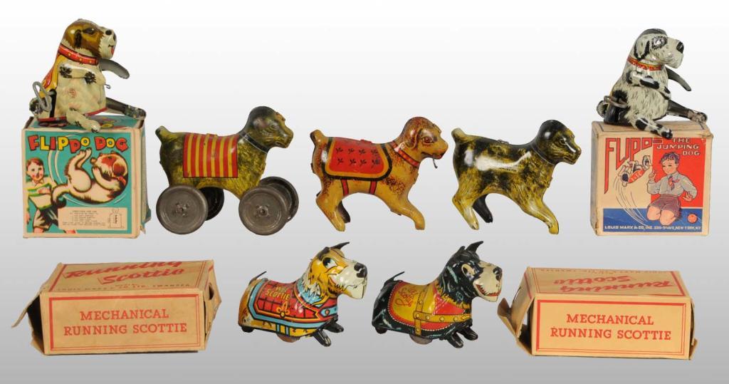Description Working. Toys with boxes are Marx made in Great Britain, two versions of the Wee Scottie with original rubber ears and tail. Also includes two versions of the Flipo, one is the earlier Marx and the other is Linemar. Along with, three Lindstrom dogs without boxes, a Laddie, a Chinook push toy, and another dog holding a cane. Includes four original boxes, two with some small tears and creasing. Condition (Very Good - Excellent). Size All: 5" L.