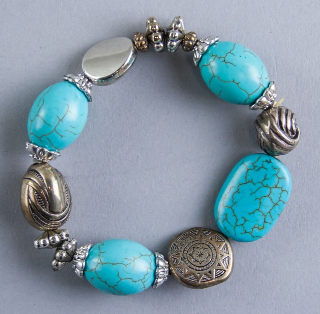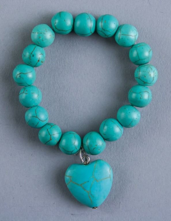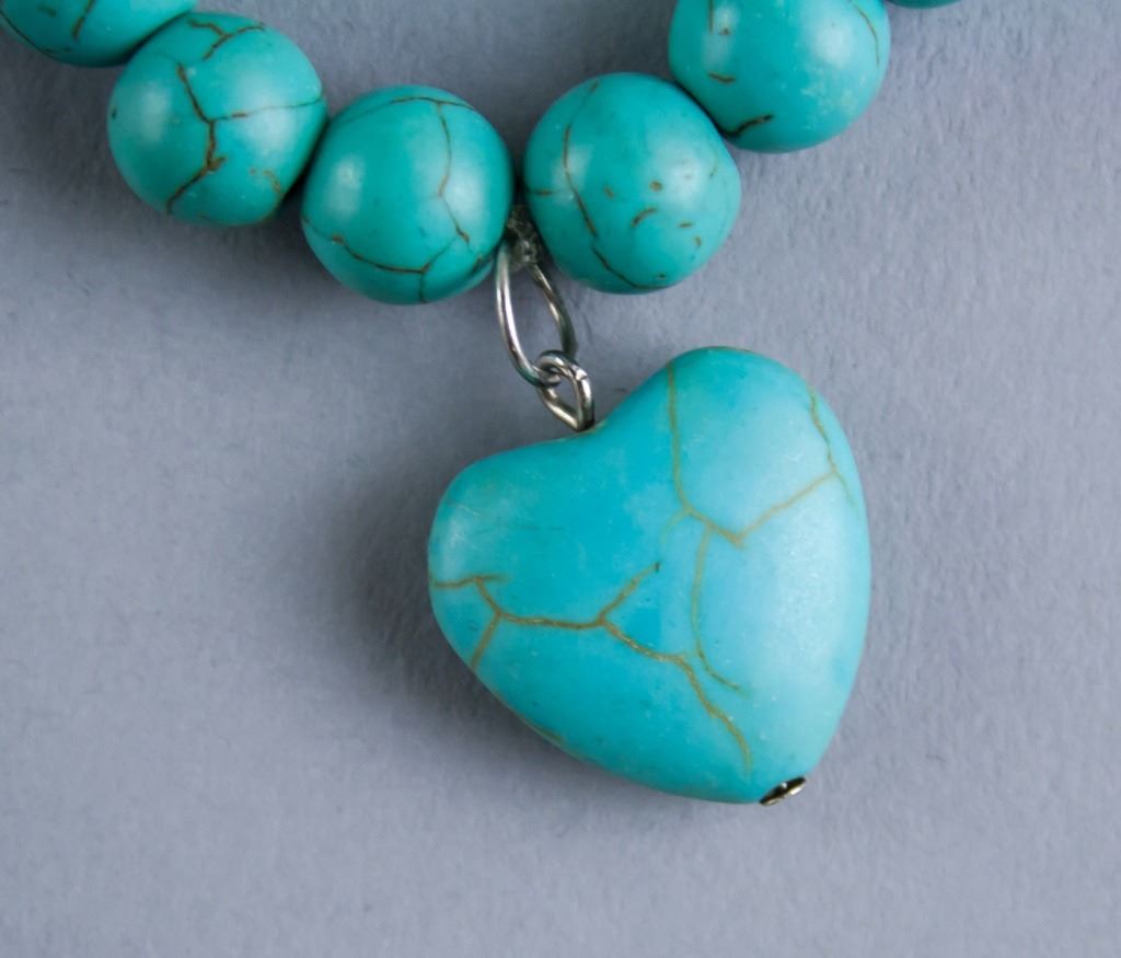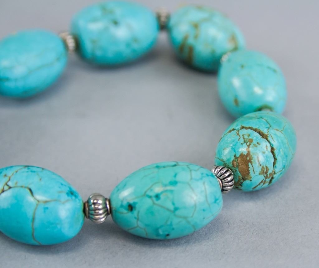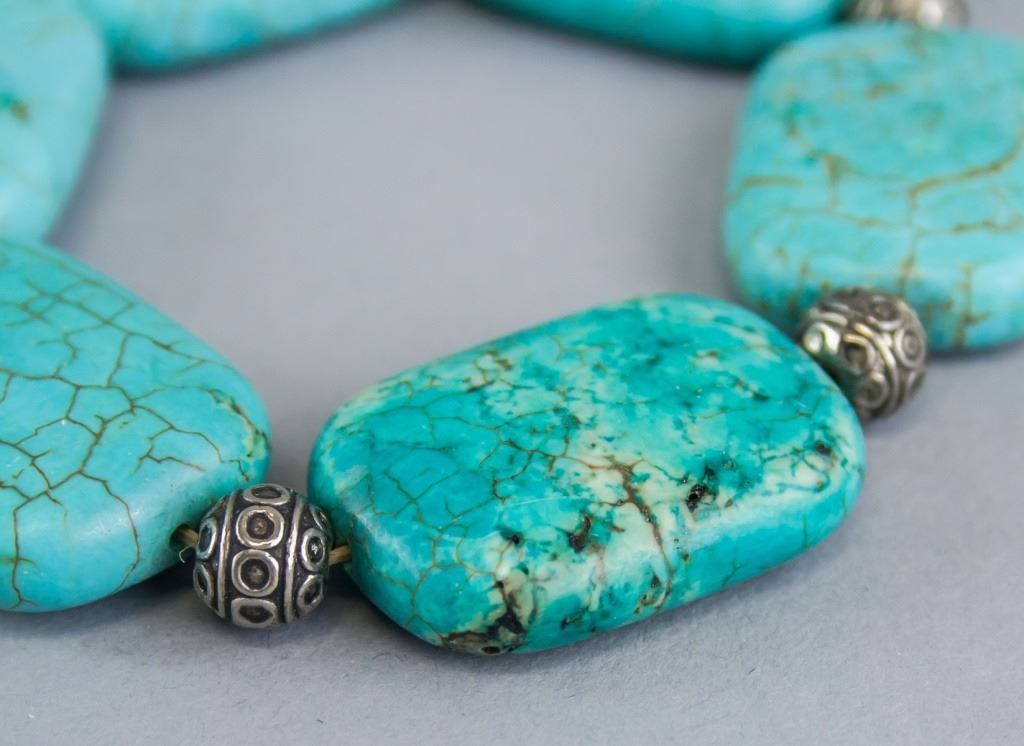 Lot of 7 turquoise bracelets and necklace. Six bracelets of different size turquoise stones. With one turquoise pendant on a silver-colored chain. 5 cm. 243 grams (total).