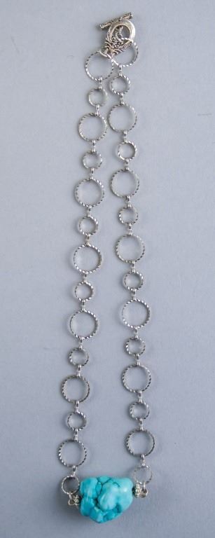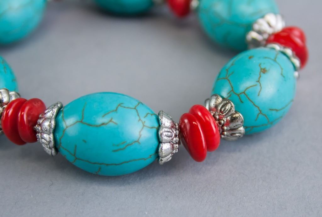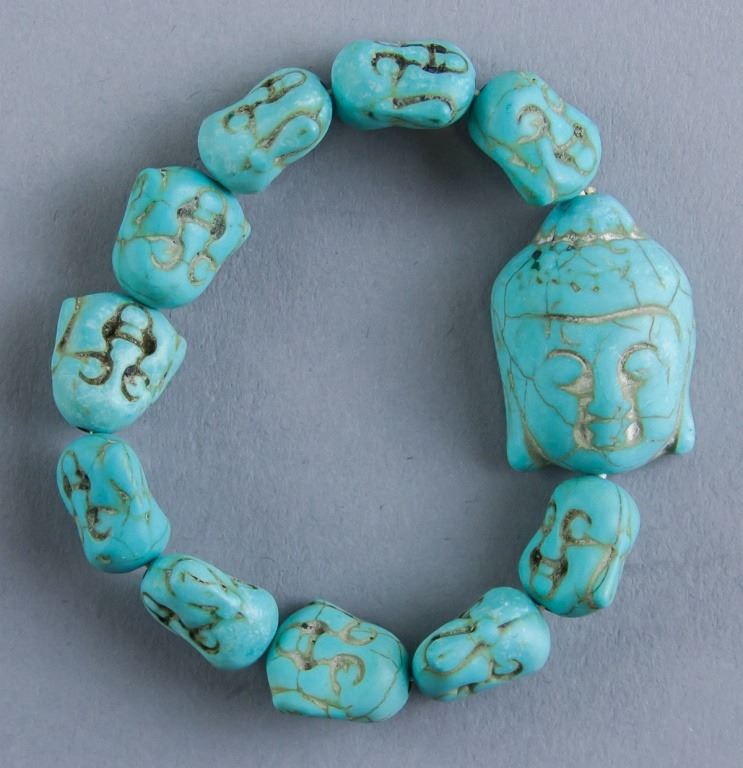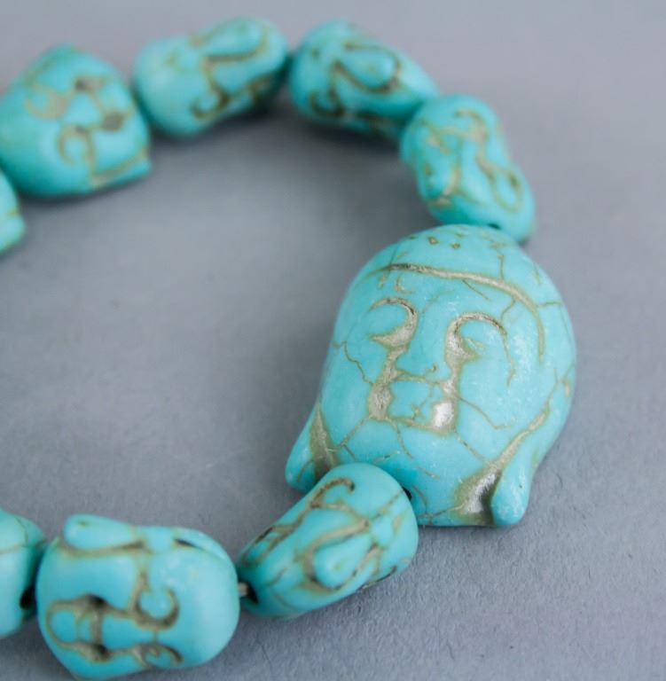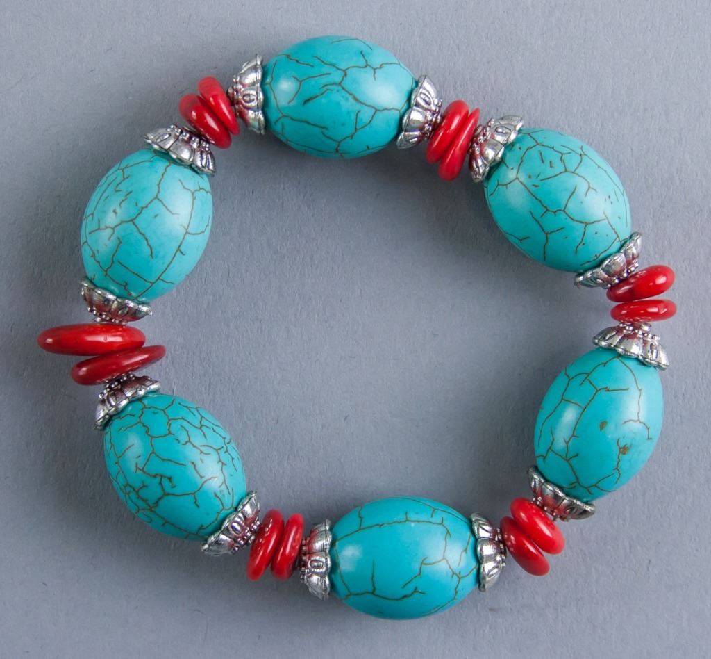 Lot of 7 turquoise bracelets and necklace. Six bracelets of different size turquoise stones. With one turquoise pendant on a silver-colored chain. 5 cm. 243 grams (total).