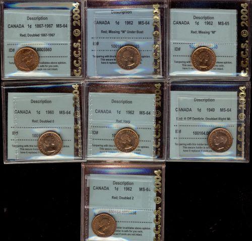 Lot of 7 "VARIETIES" CCCS graded Small cents; 1949 "A" off dent. (Doubled right ML) MS64 Red, 1960 (Doubled 0) MS64 red, 1962 (Harp) MS64 Red, 1962 (Missing M) MS65 Red, 1962 (Doubled 2) MS64 Red, 1962 (Missing M under bust) MS64 Red, 1967 (Doubled date)