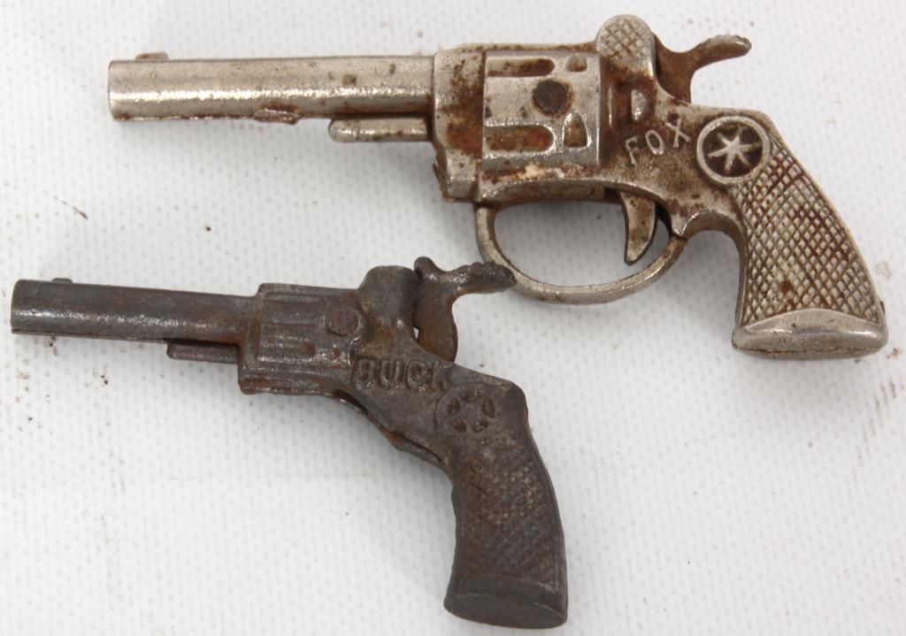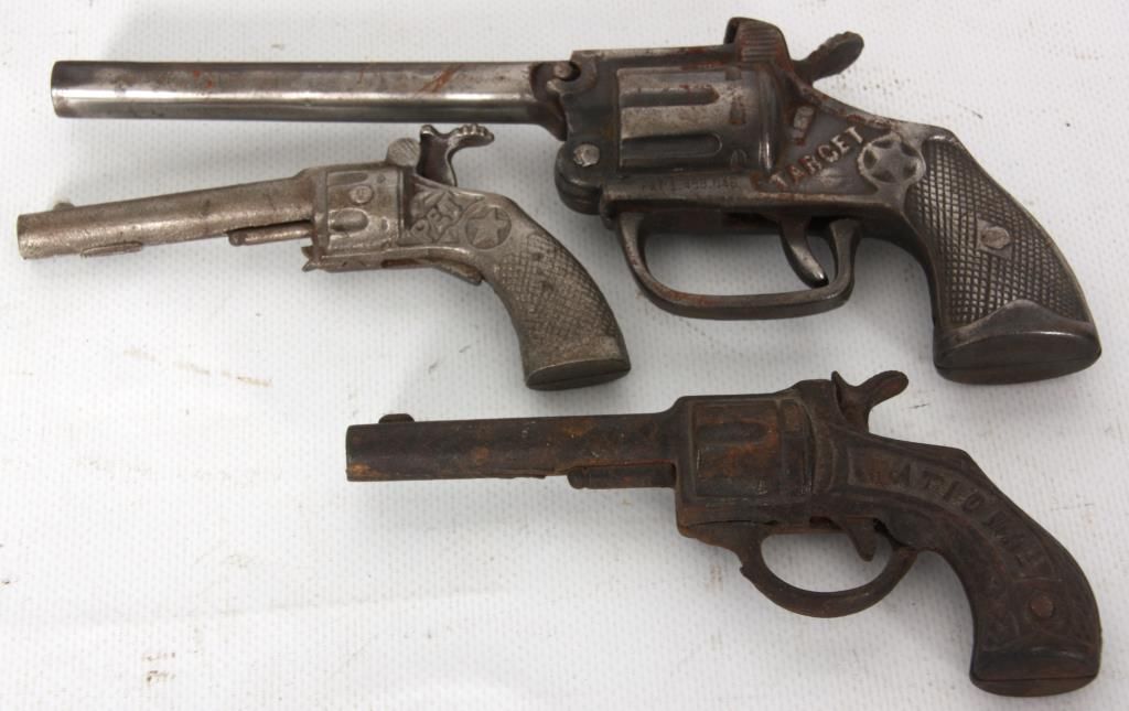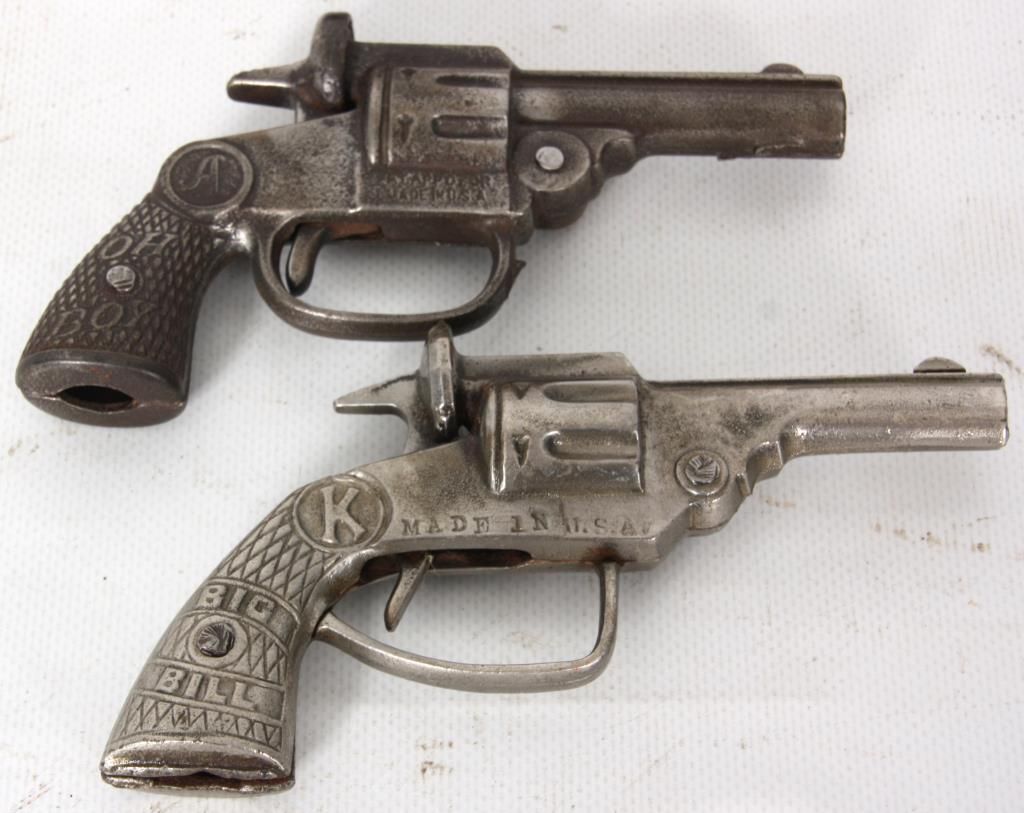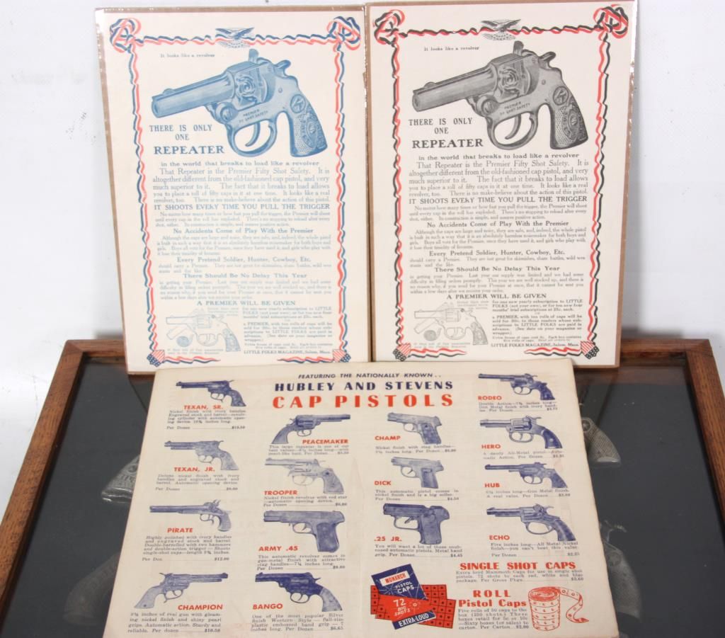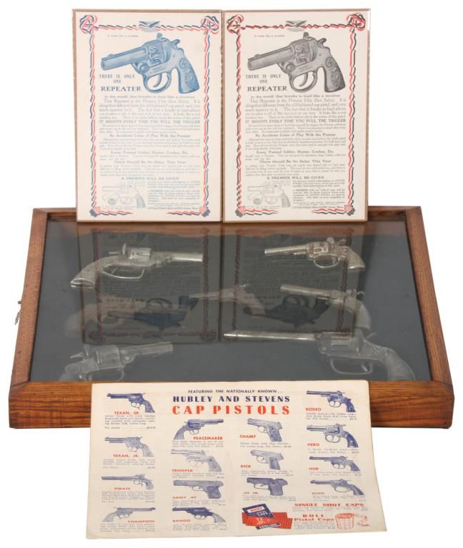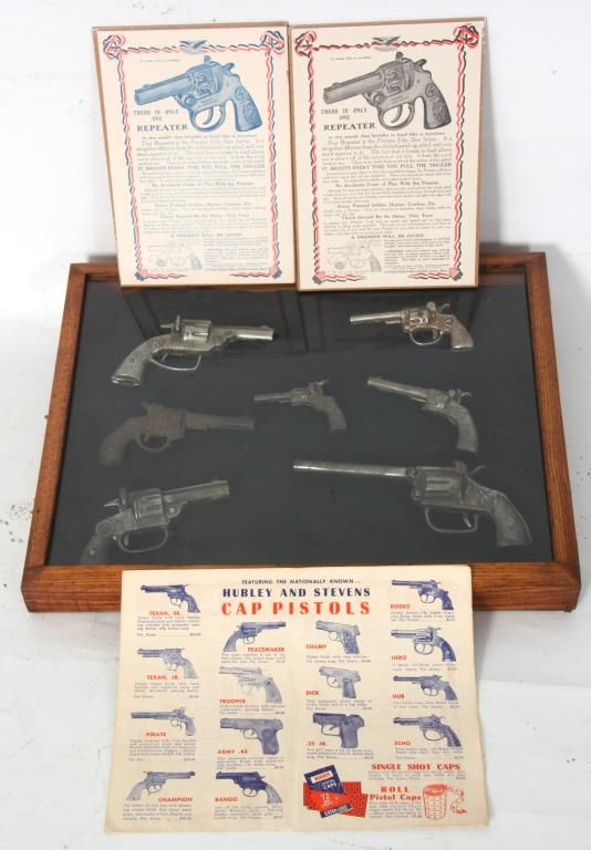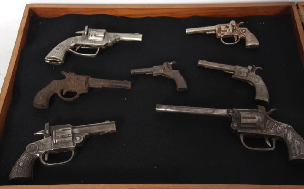 Lot of 7 Vintage Cast Iron Cap Guns. Selection of 4 by Hubley, including the named Target, Pet, Fox and Buck; one by National, one by Andes, titled “Oh Boy” and one by Kilgore, titled “Big Bill”. Each is very nice and in corking condition, in a display case with printed advertisements.