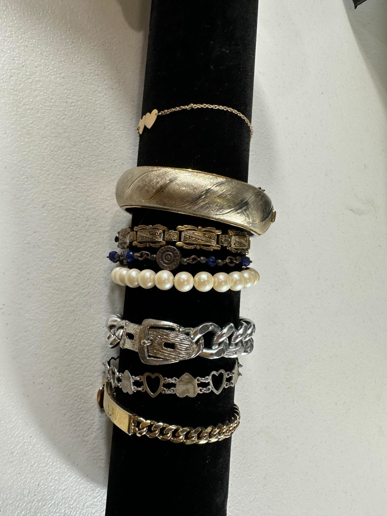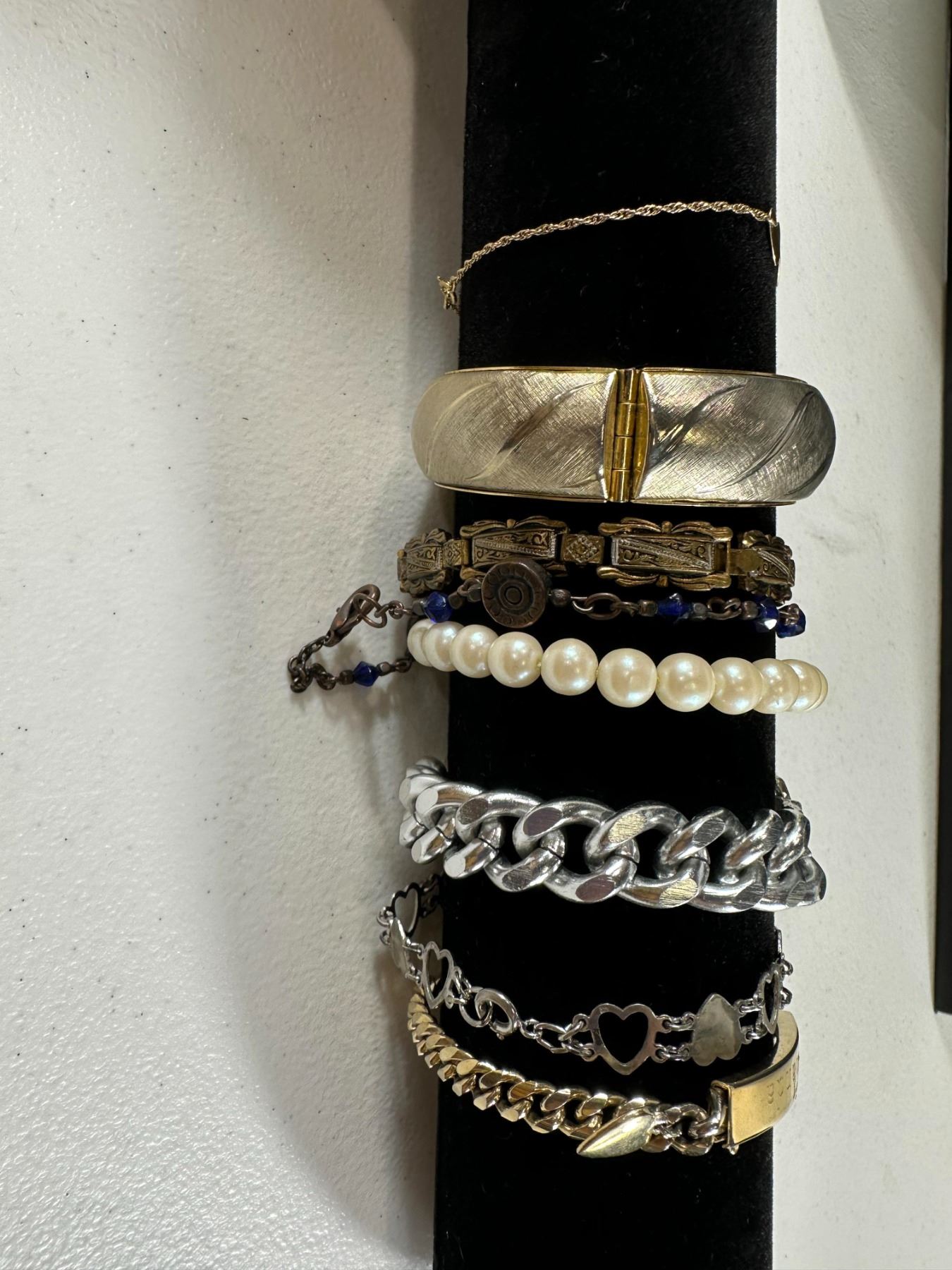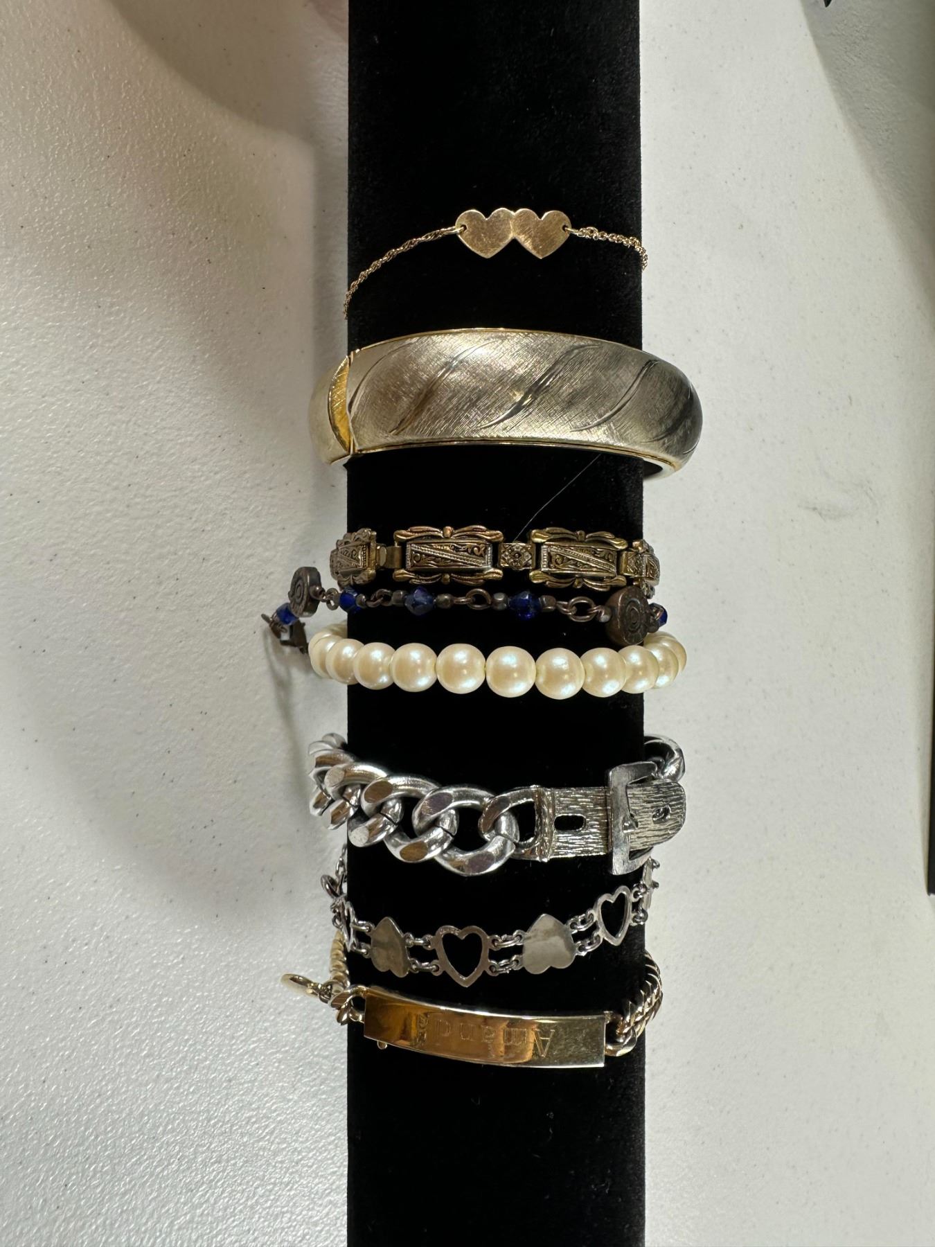 A stylish collection of seven vintage and modern bracelets featuring both silver- and gold-tone finishes. Includes a wide textured cuff, delicate double-heart chain bracelet, and engraved nameplate bracelet, Faux pearl strand, silver buckle-style link bracelet, and heart motif chain designs
