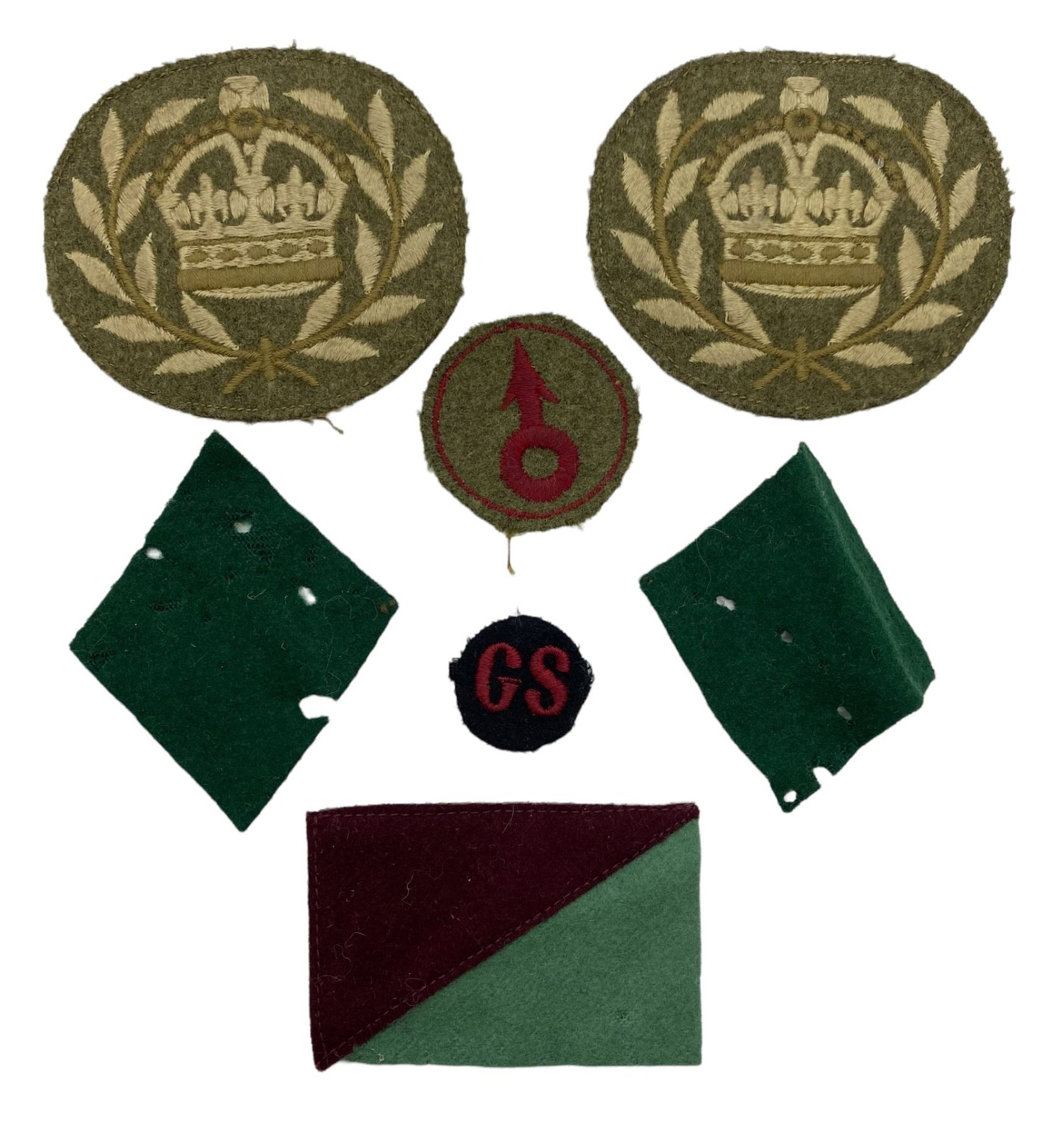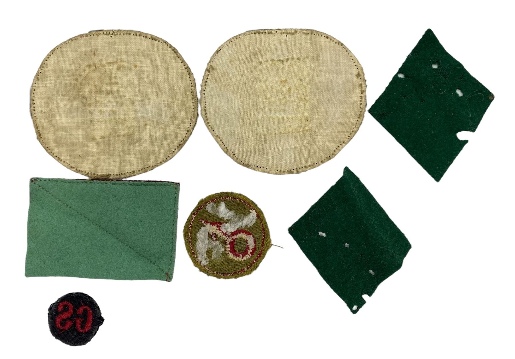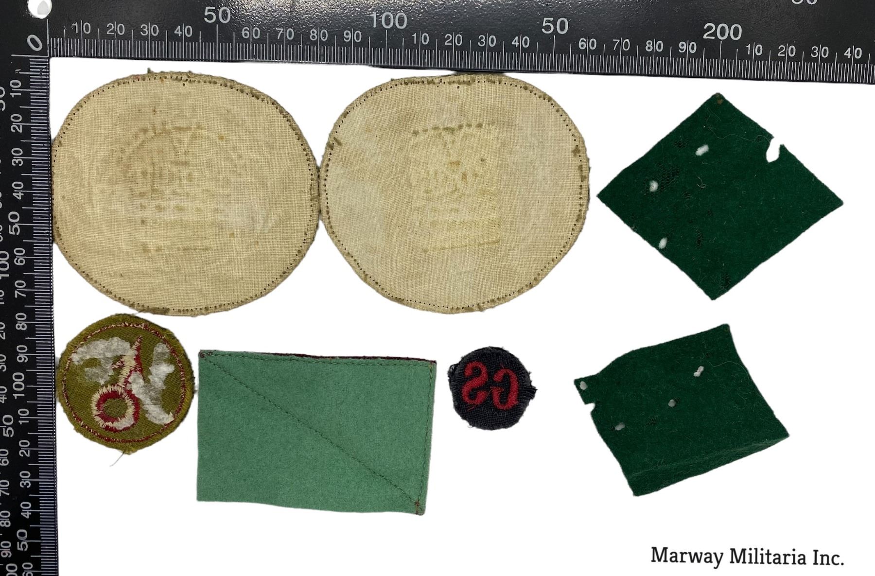 Lot consists of three Div. patches (moth nibbles), Mars badge, GS Badge, Two Warrant Ranks