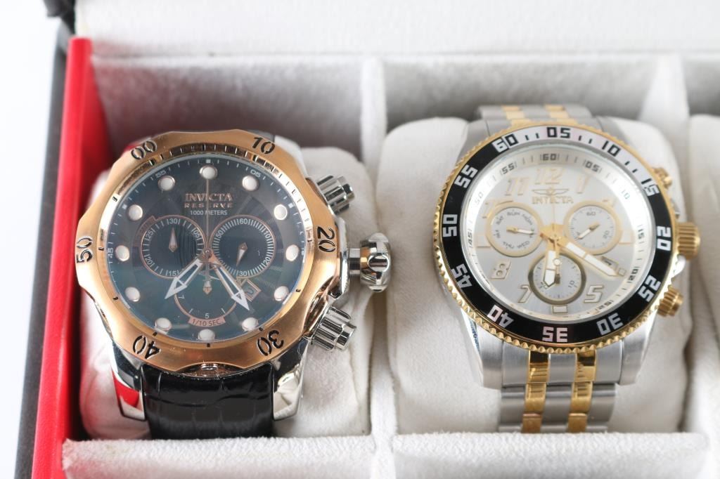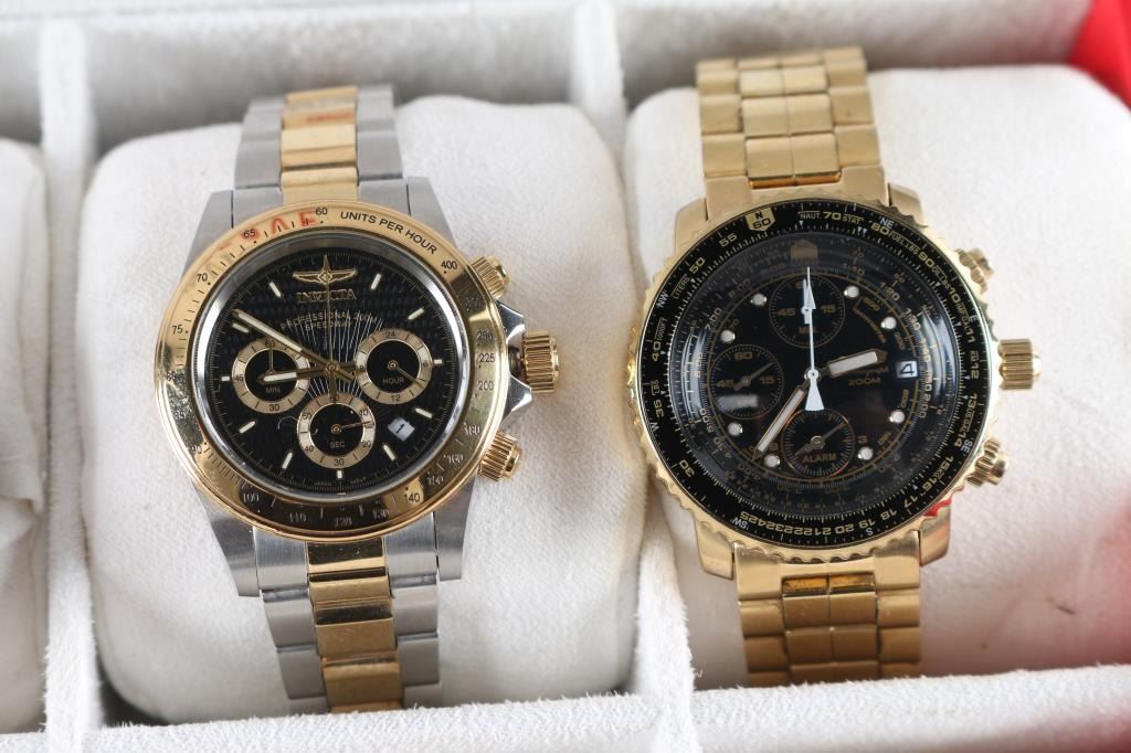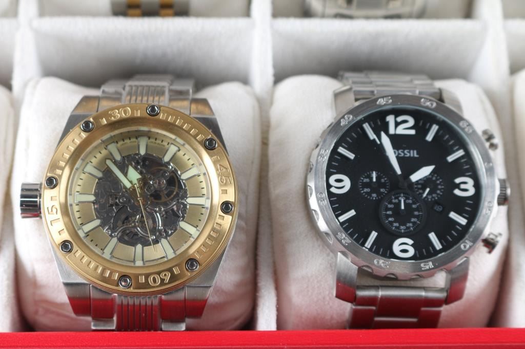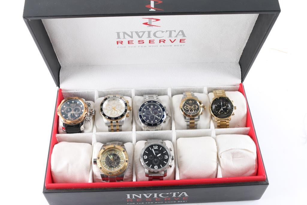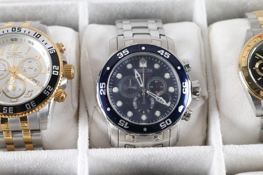 Includes: (4) Invicta Chronographs; (1) Seiko Flight Chronograph (gold plated); (1) Android Powerjet Divemaster; (1) Fossil Chronograph; (1) Fossil Chronograph.