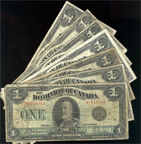 Lot of 7 different 1923 $1 notes. Includes DC-25f, 25g, 25h, 25i, 25j, 25n and 25o. Grades are VG-F or better.