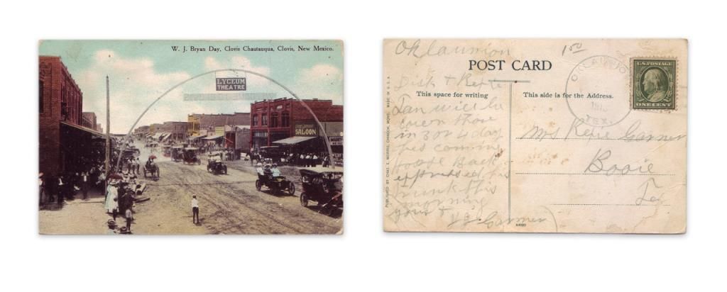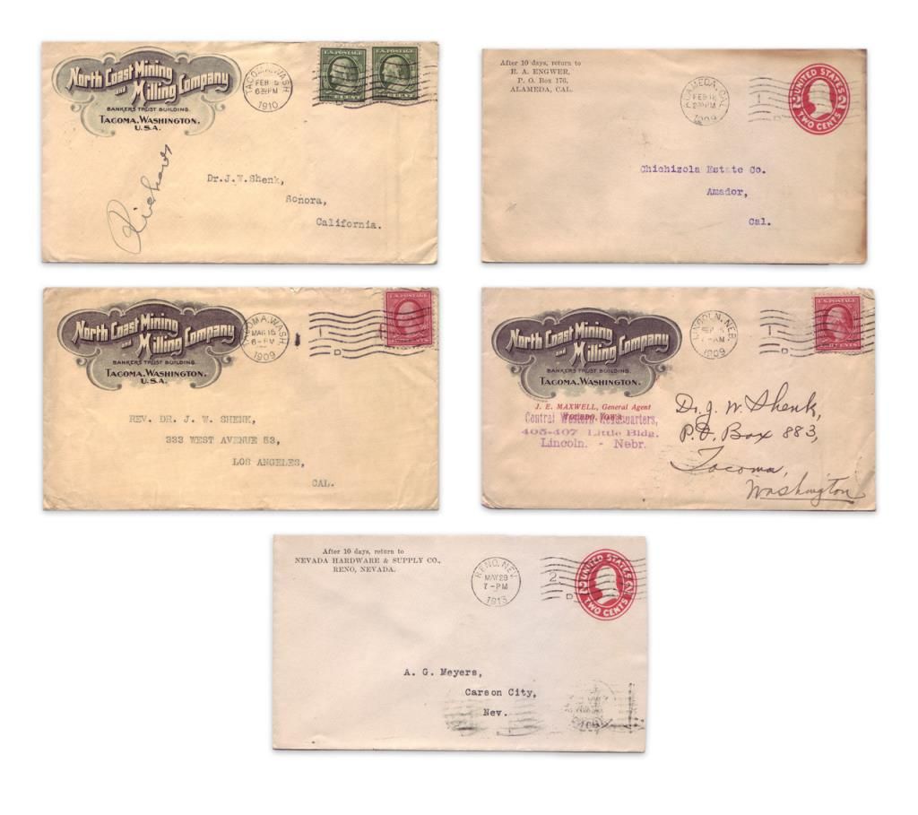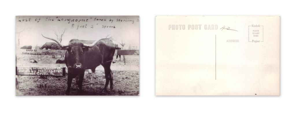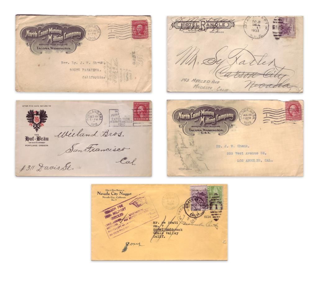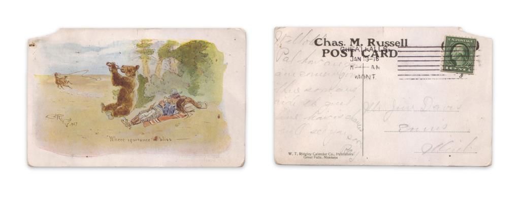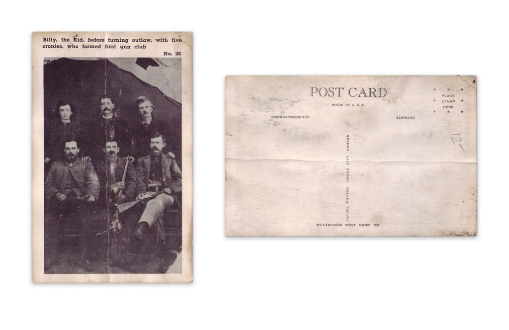 Lot of 7 old Western-related postcards in protective sleeves including an old street scene of San Antonio St. in El Paso, Texas, a warrior in full regalia holding a Colt SAA, a steamer ship on the Sacramento Delta, two Charlie Russellpaintings, a photo of the “Last of the Longhorns in Cristo, Texas with a spread of horns 8 ft., 2” and a photo postcard of “Billy the Kid before turning outlaw, with five cronies who formed first gun club”; also 9 early stamped and cancelledenvelopes including several North Coast Mining and Milling Co. sent examples, a Hotel Randle of Tucumcari, N.M, Nevada City Nugget, Nevada City, CA., etc. Est.: $50-$75.