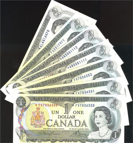 Lot of 7 replacement 1973 $1 notes BC-46aA. Includes *AL, *FA, *AN, *FV. Some sequential notes. All notes choice uncirulated or better.