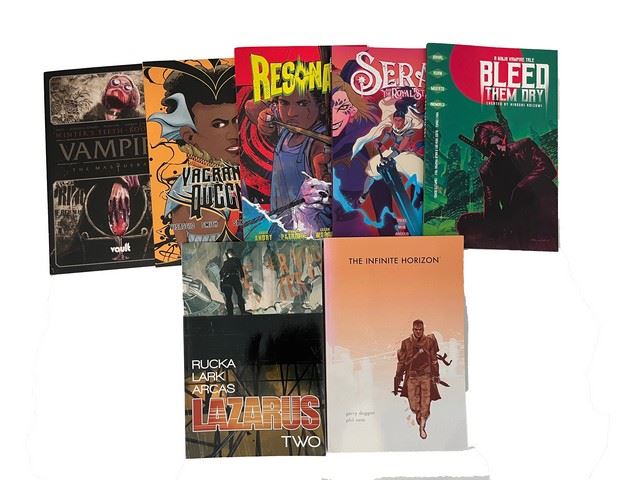 Lot of 7 trade paperback books from Vault and Image Comics: "Bleed Them Dry" "Sera and the Royal Stars", Resonant" volume 2, "Vagrant Queen", "Vampire The Masquerade" book one. From Image "Lazarus" volume 2, "The Infinite Horizon". (11"x7") From Constantine Film's production office archives.