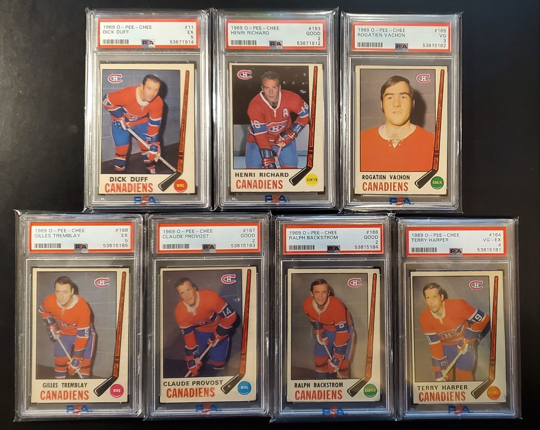 Nice mixed lot of 1969 O-Pee-Chee Montreal Canadiens cards, all PSA graded, including: #11 HOFer Dick Duff (PSA 5), #163 HOFer Henri Richard (PSA 2), #164 Terry Harper (PSA 4), #165 HOFer Rogie Vachon (PSA 3), #166 Ralph Backstrom (PSA 2), #167 Claude Provost (PSA 2), and #168 Gilles Tremblay (PSA 5).