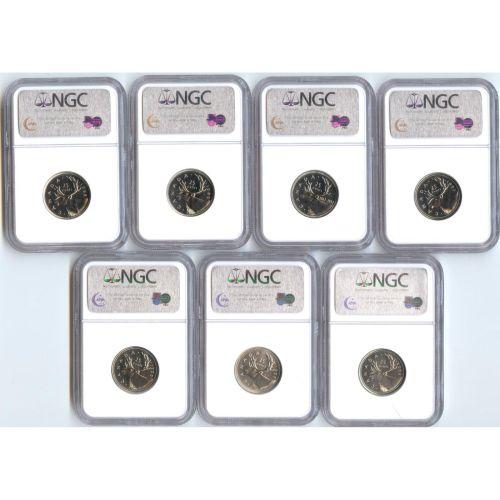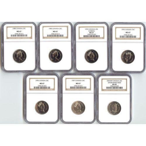 25 Cents 1988, 1989, 1992 Caribou,1993, 1995, 1997 all NGC graded MS-67 & 2003WP Uncrowned Bust NGC graded MS-66. All coin from Uncirculated sets. Lot of 7 coins.