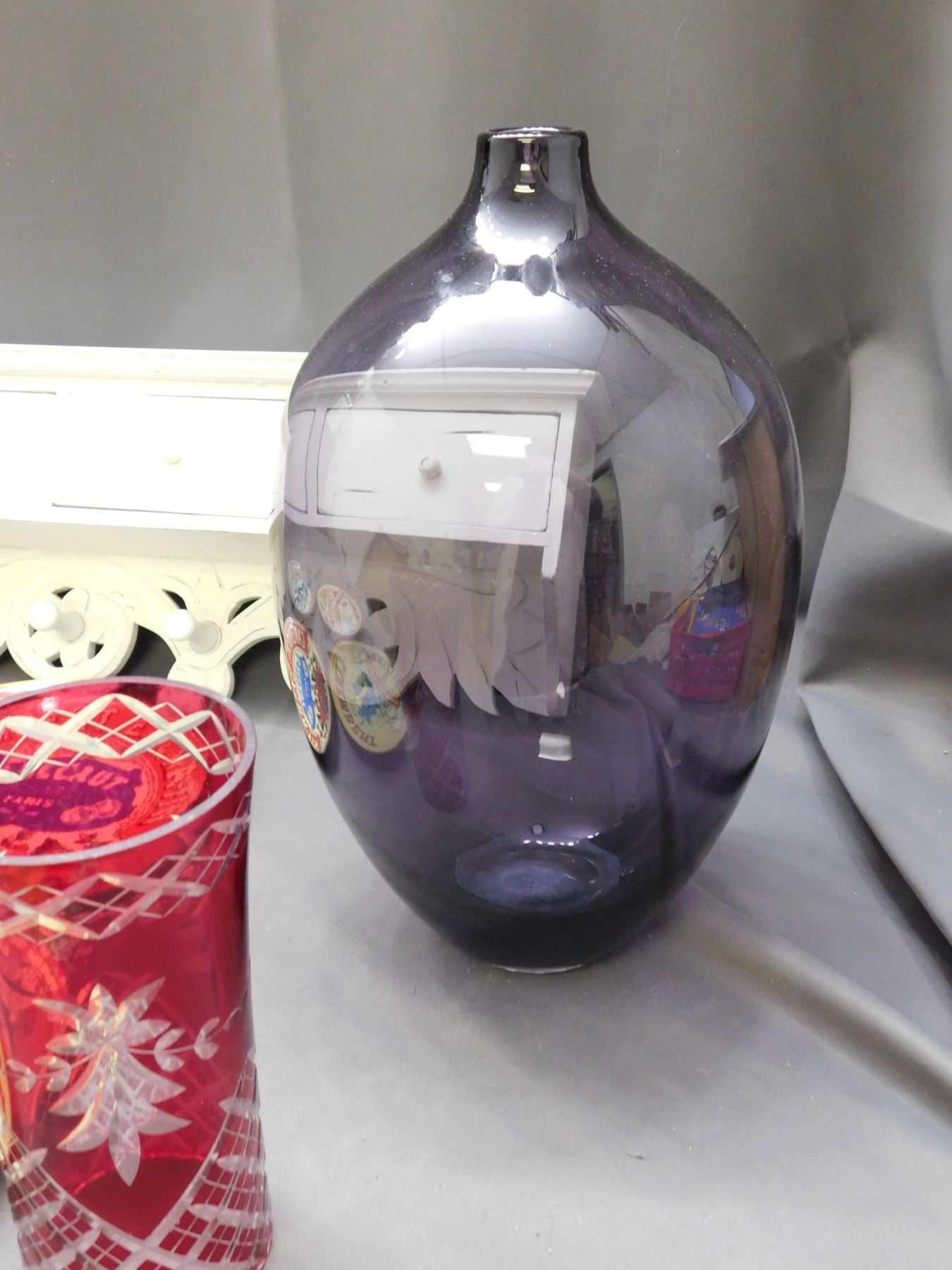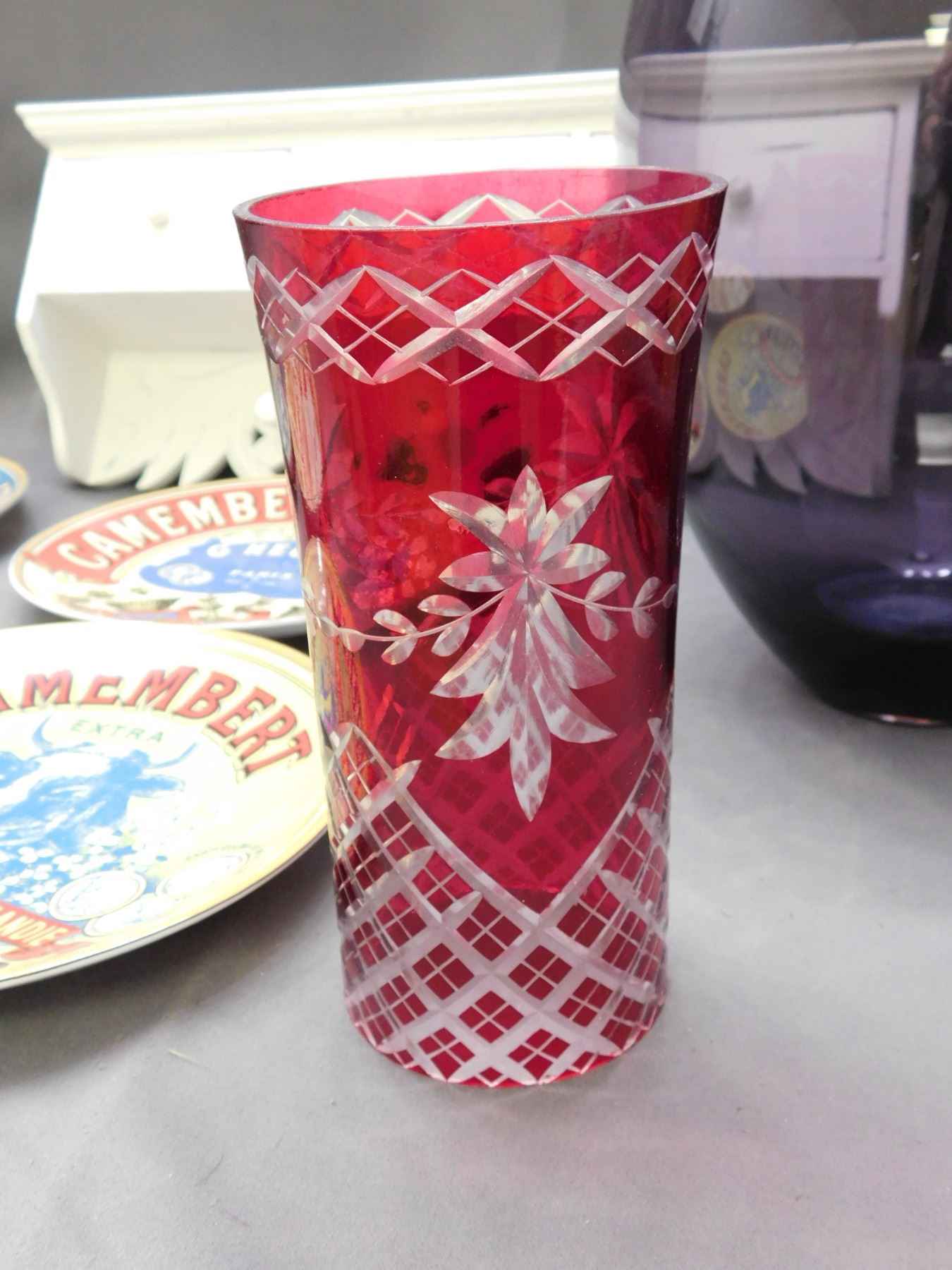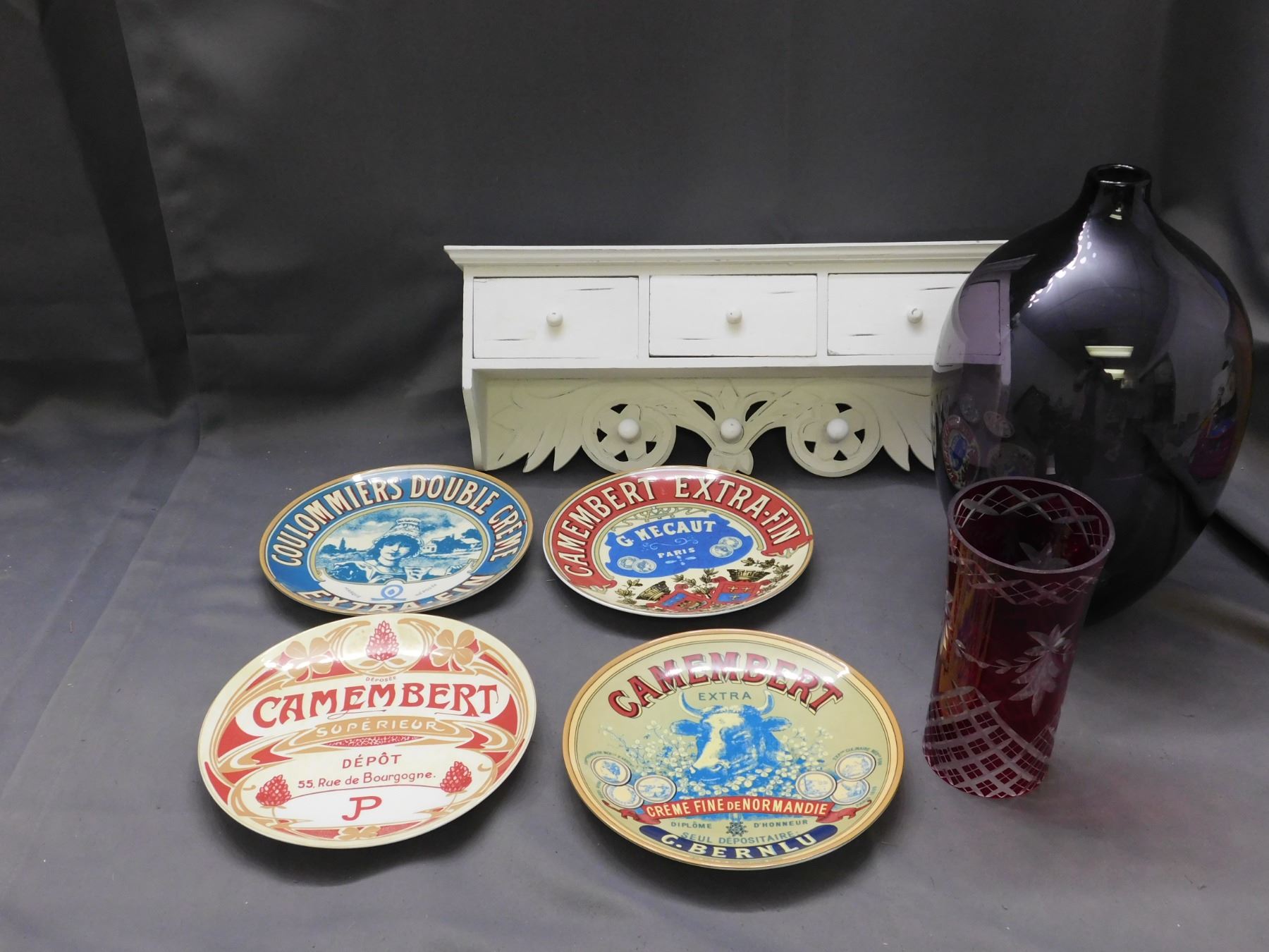 Lot of 7pcs Advertising Plates, Purple Glass Vase, Red Vase, Entryway Coat Hook / Keybox