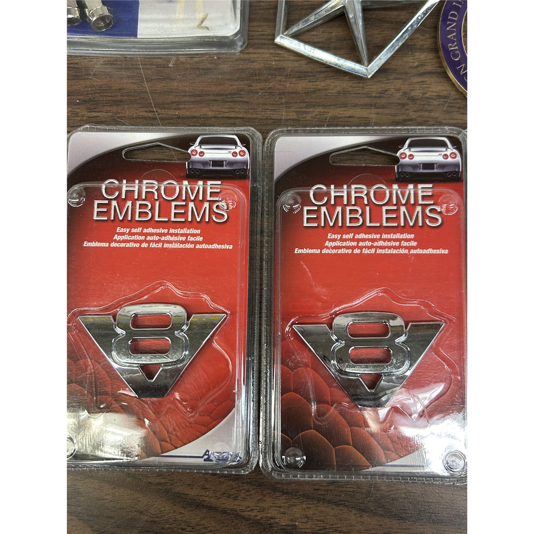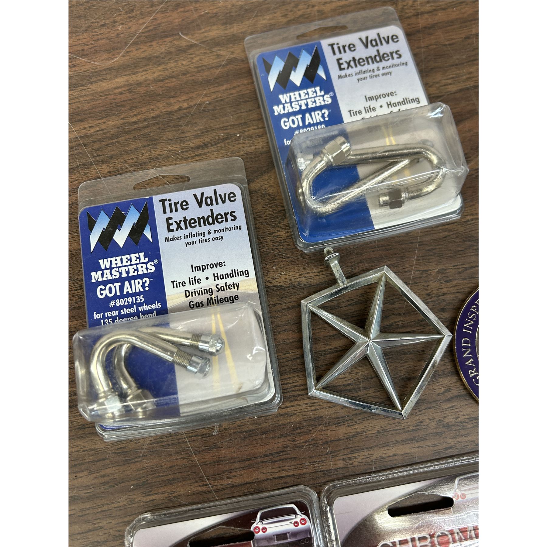 Lot of 7pcs Tire Valve Extenders, Chrome Emblems, Etc