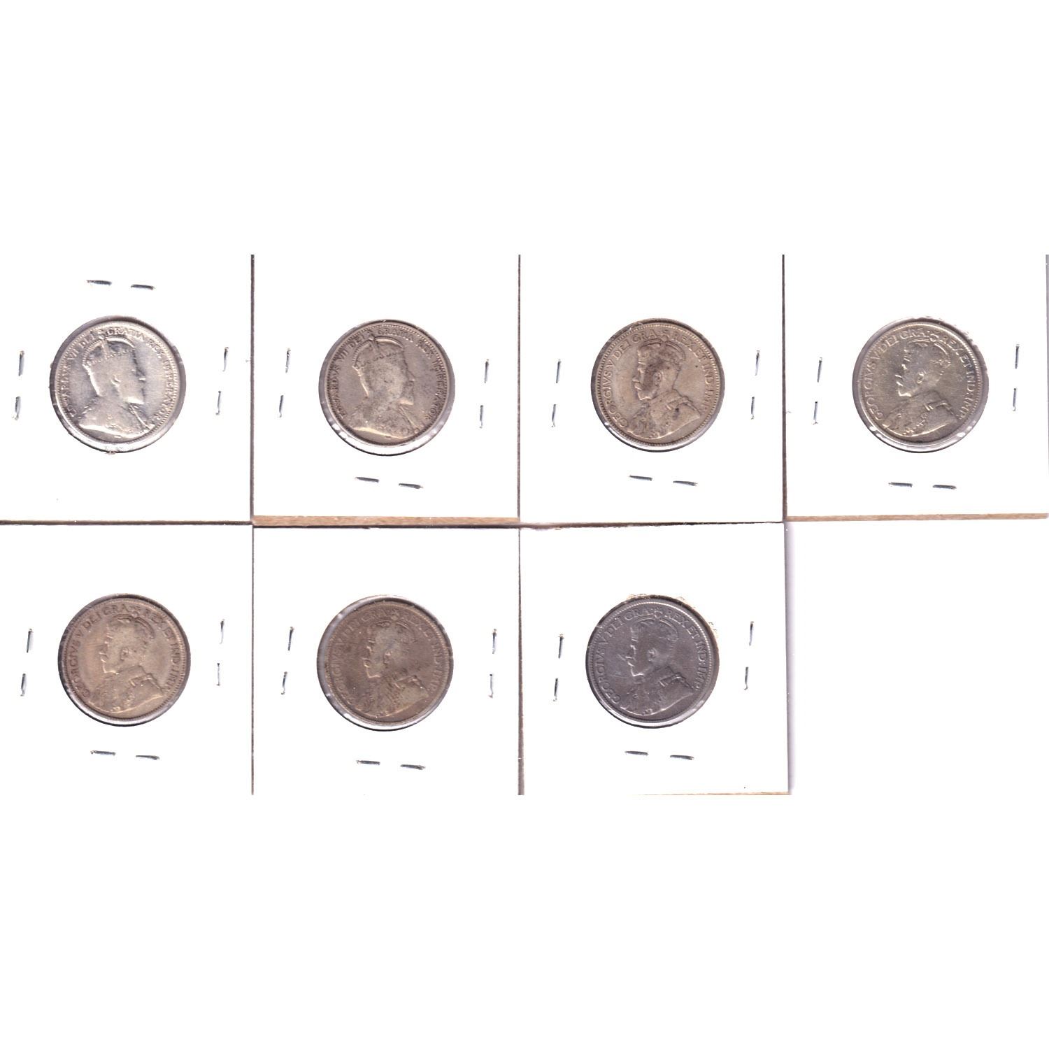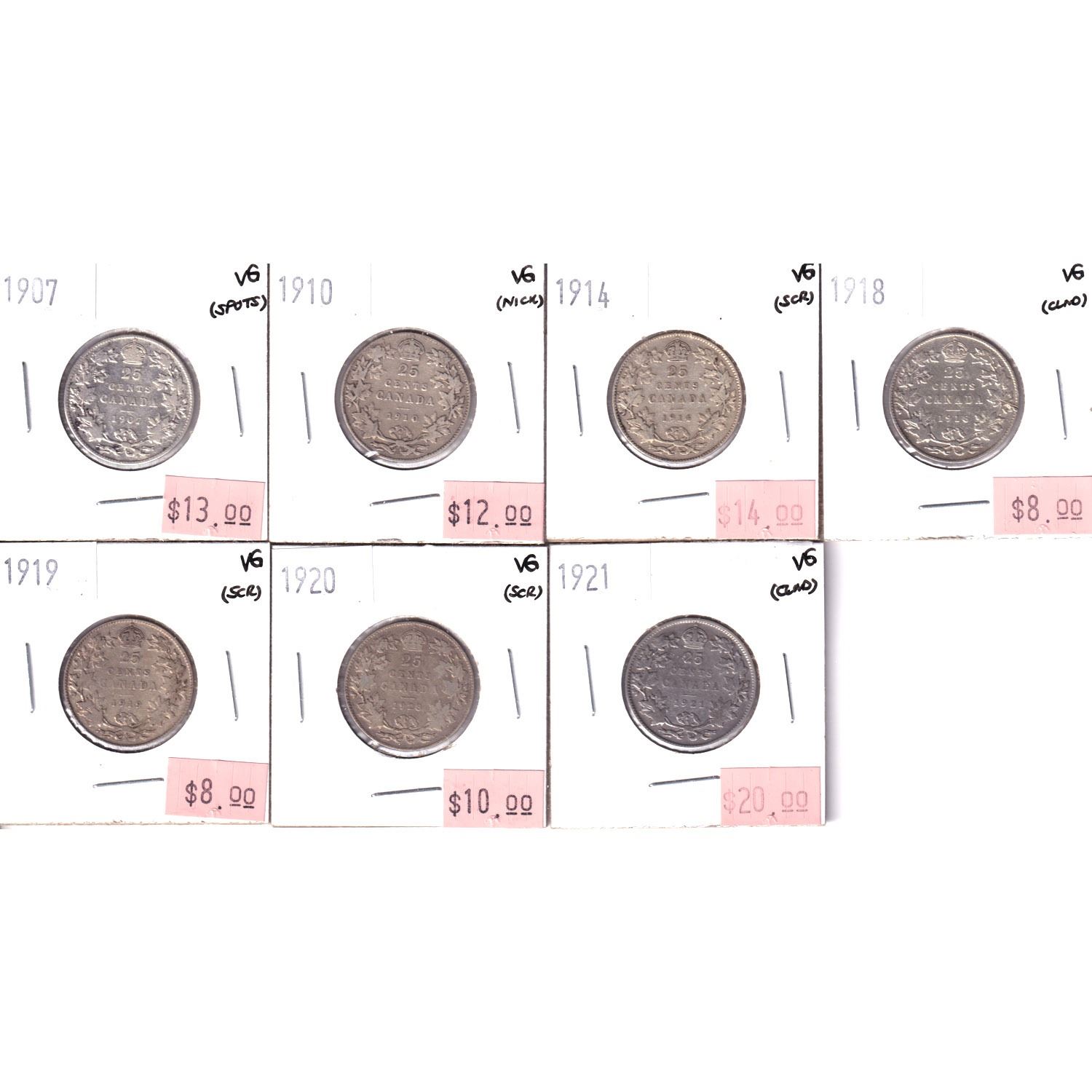 Lot of 7x 1907-1921 Canada Silver 25-cents VG Condition. Coins contain various imperfection.