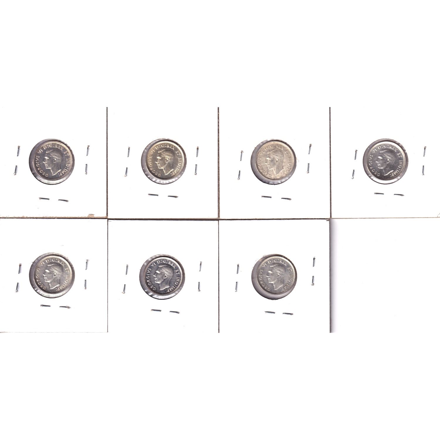 Lot of 7x 1937- 1945 Canada 10-cent EF to UNC. Lot Includes: 1937 AU-UNC; 1940 AU; 1941 EF-AU; 1942 EF-AU; 1943 AU; 1944 EF-AU; & 1945 EF-AU. Coins contain various imperfections; please see image for details. 7pcs.