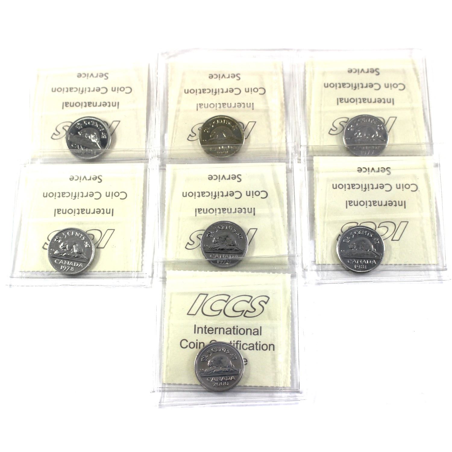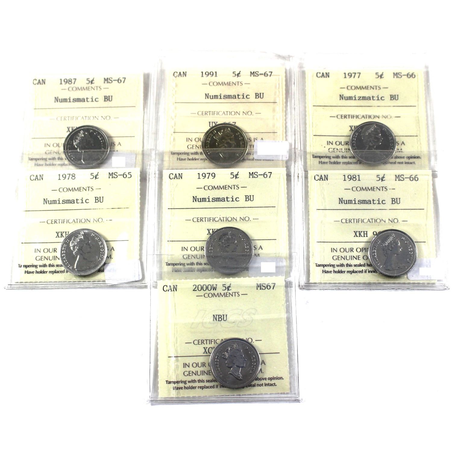 Lot of 7x 1977-2000 Numismatic BU, Canada 5-cent ICCS Certified MS-65 to MS-67. Lot Includes: 1977 MS-66; 1978 MS-65; 1979 MS-67; 1981 MS-66; 1987 MS-67; 1991 MS-67; & 2000W MS-67. Some coins contain natural toning 7pcs.