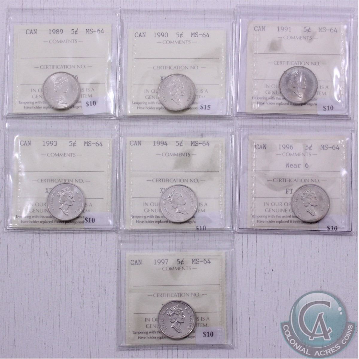 Lot of 7x 1989-1997 Canadian 5-cent ICCS Certified coins in MS-64. The dates included in this lot are: 1989, 1990, 1991, 1993, 1994, 1996 Near 6 and 1997. (7pcs)