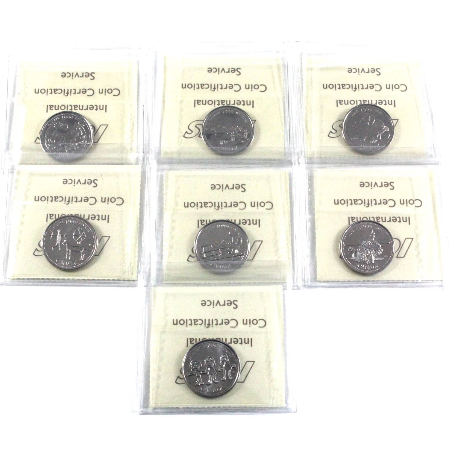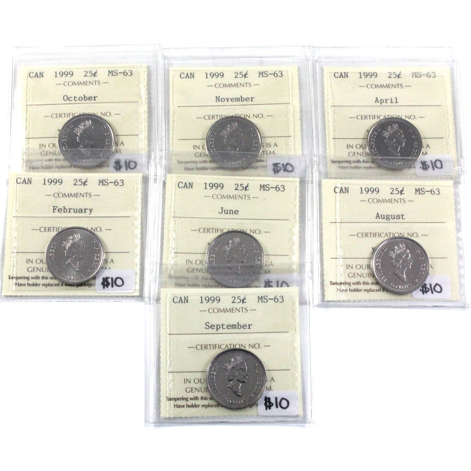Lot of 7x 1999 Canada commemorative 25-cent ICCS Certified MS-63. you will receive October, November, April, February, June, August & September.