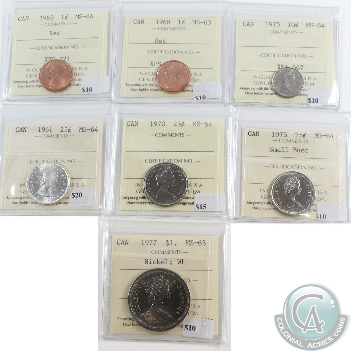 Lot of 7x Canada 1-cent, 10-cent, 25-cent & $1 ICCS Certified MS-63/64. You will receive 1963 1-cent MS-64, 1968 1-cent MS-63, 1975 10-cent MS-64, 1961 25-cent MS-64, 1970 25-cent MS-64, 1973 25-cent Small Bust MS-64 & 1977 $1 WL MS-63. 7pcs