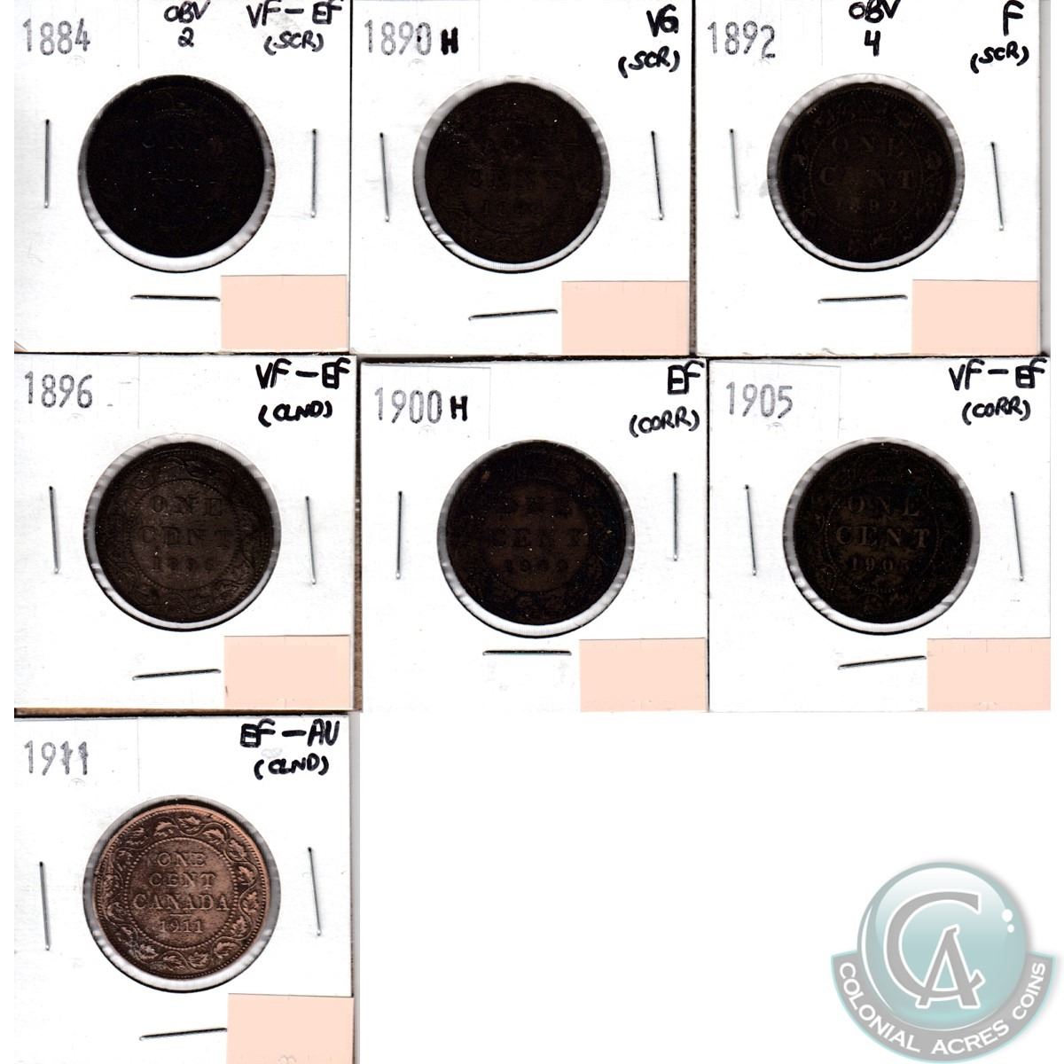 Lot of 7x Canada 1-cent Dated 1884 Obverse 2, 1890H, 1892 Obverse 4, 1896, 1900H, 1905 & 1911 in VG to EF-AU (coins have various impairments). 7pcs