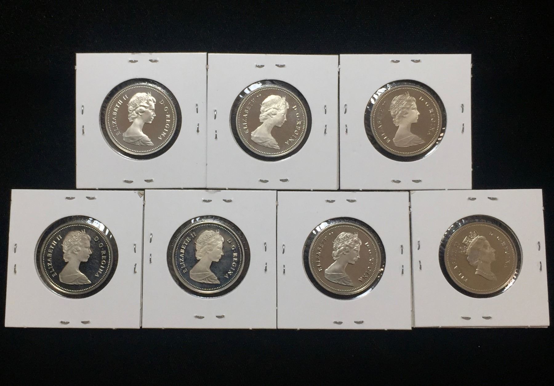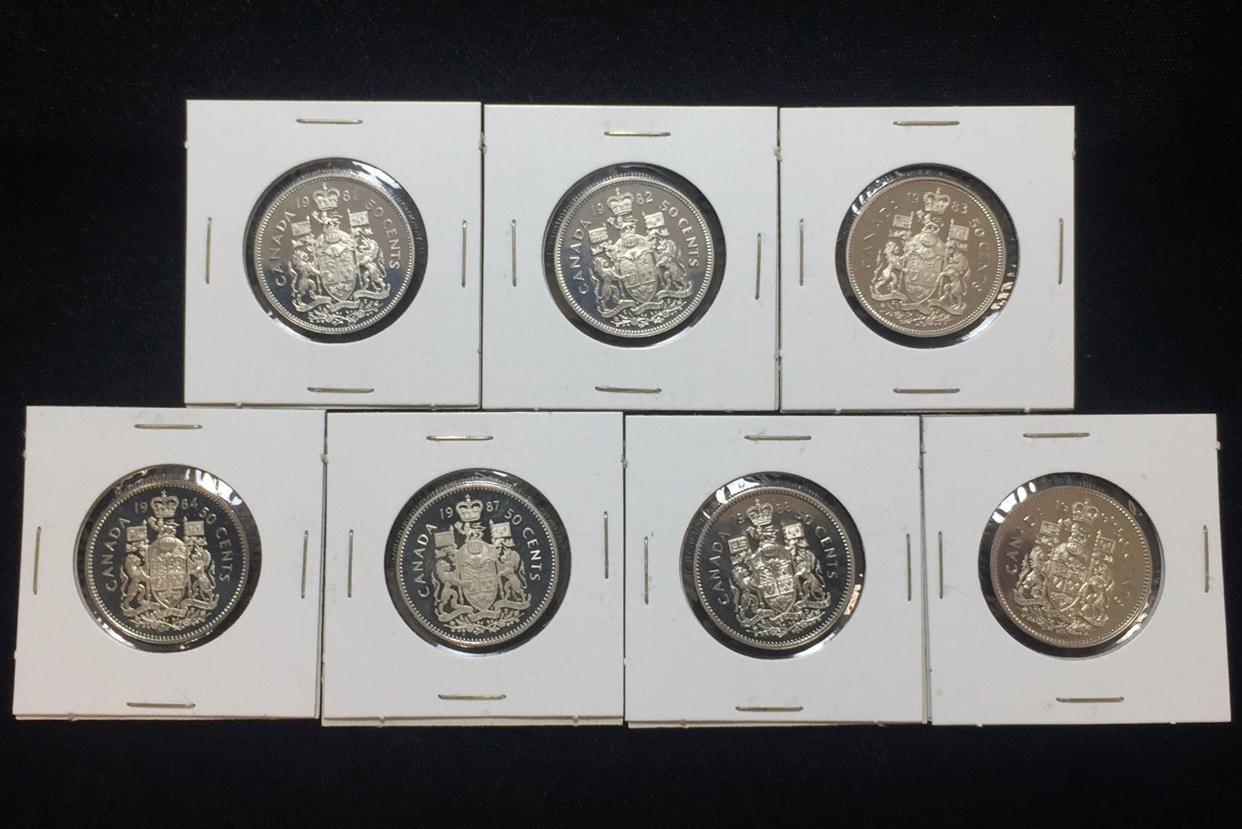 Lot 241; Royal Canadian Mint, Lot of 7x Canada 50-Cents Proof Coins, Dates Include 1981, 1982, 1983, 1984, 1987, 1988, 1990, Uncirculated, Queen Elizabeth II Tiara Portrait, Effigy, Condition as Pictured