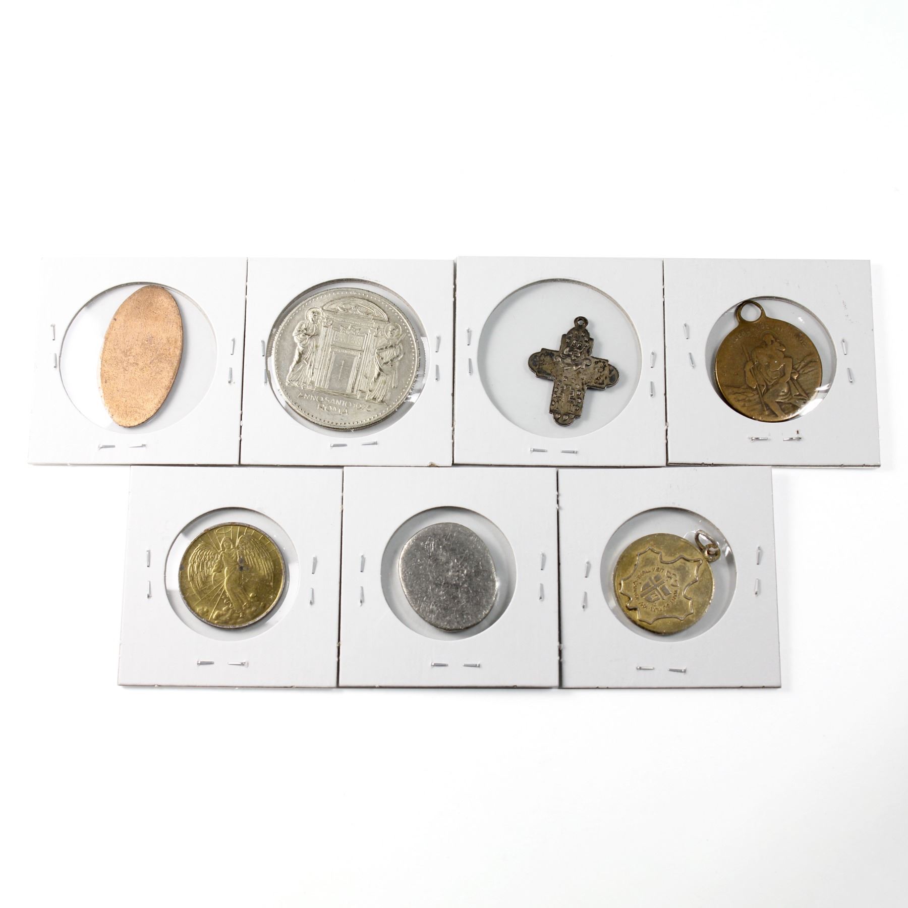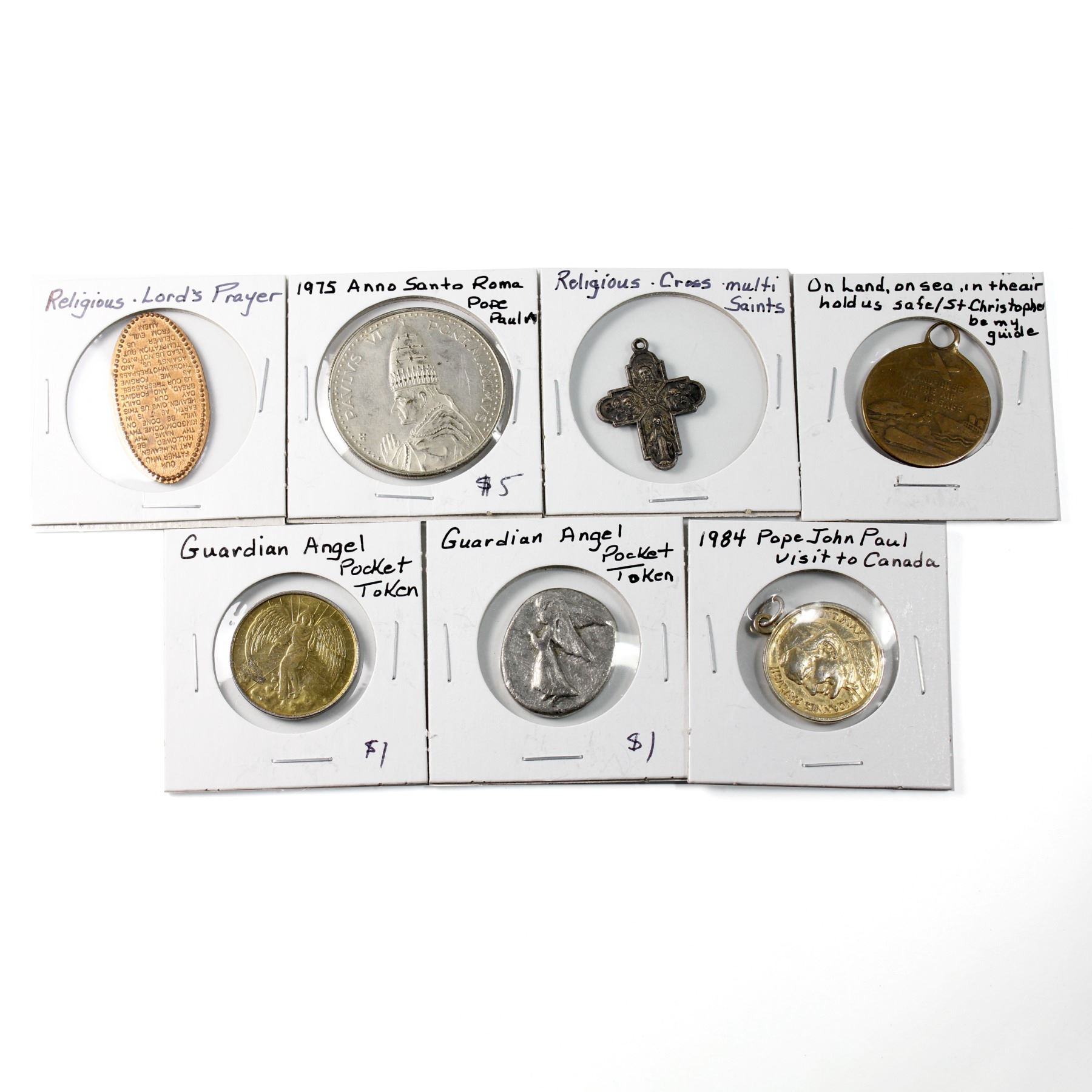 Lot of 7x Religious Christian Tokens. Includes 1984 Pope John Paul Visit to Canada, 1975 Anno Santo Roma Pope Paul, Lord's Prayer Rolled Penny, Guardian Angel Pocket Token, St Christopher Hold Us Safe Token, Religious Cross with Christian Imagery, Golden Coloured Guardian Angel Pocket Token.