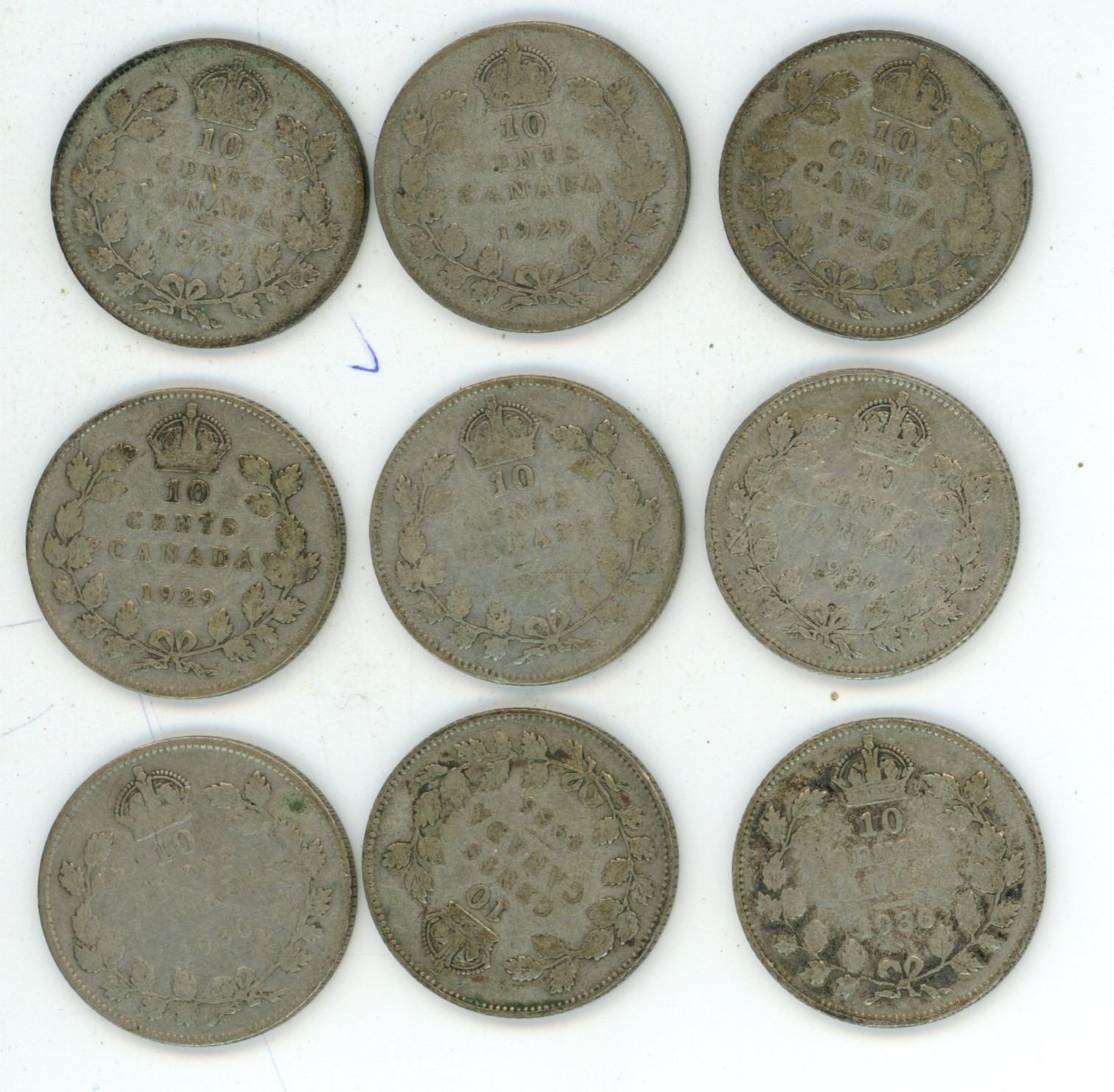 Lot of 8- 1928, 2x1929, 1931,1935 and 4x1936 silver dimes