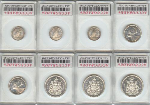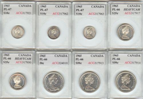 Lot of 8 ACG certified coins. 3 X 10 Cents 1965 all PL-67, 2 X 25 Cents 1965 all PL-66 Heavy Cameo, 3 X 50 Cents all PL-66.
