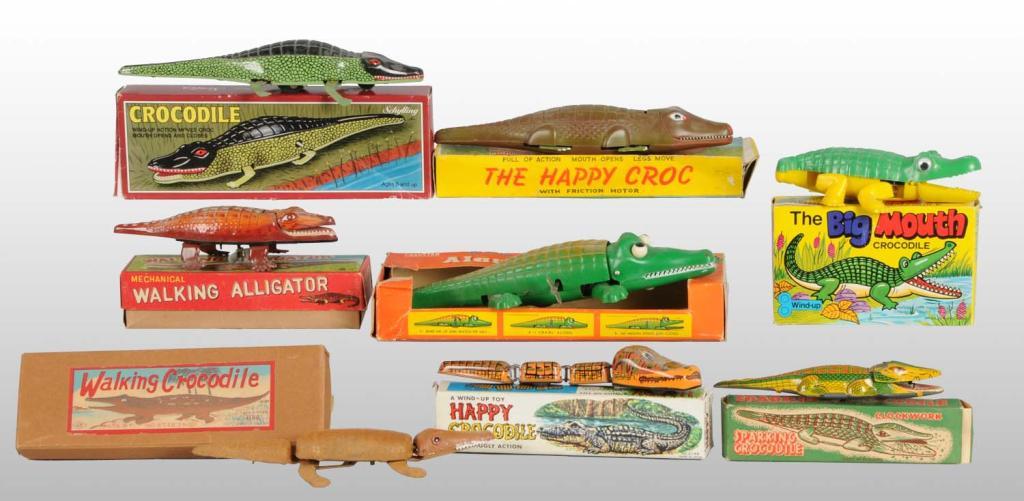 Description Includes seven wind-up toys and one friction toy. Working. Three toys are plastic and five are tin. One tin toy is plush-covered, three are Japanese, one is English, three are from Hong Kong, and one is contemporary Schylling. Most have mouths that open and close and one has sparks shooting out of its mouth. Includes original boxes with creasing on one or two. Condition (Excellent). Size Largest: 9" L.