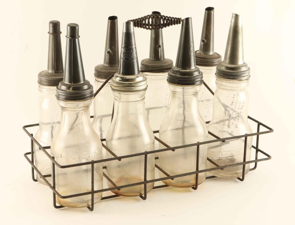 Metal rack with handle contains eight glass bottles with metal screw on spouts, two of which have caps. Marquette Mfg. Duraglass and one other.