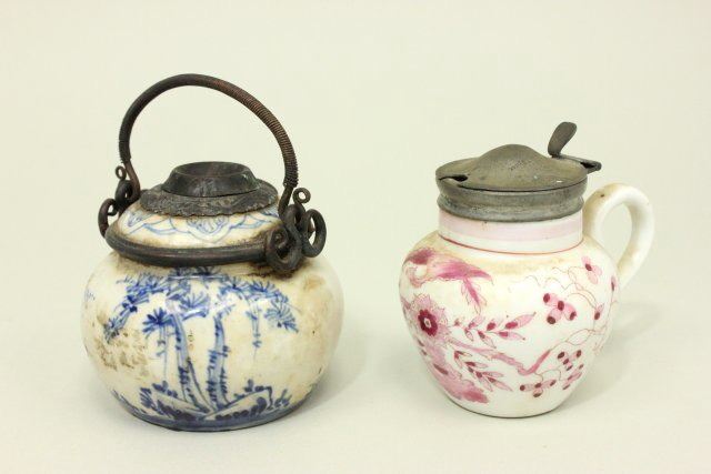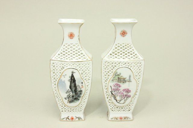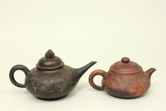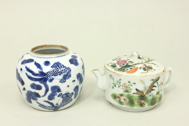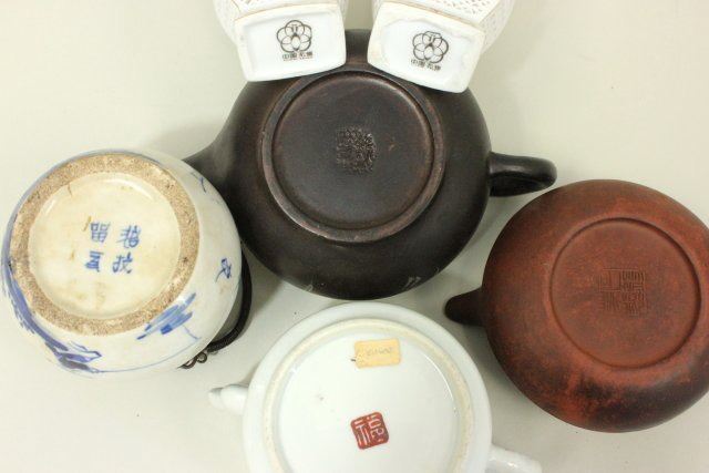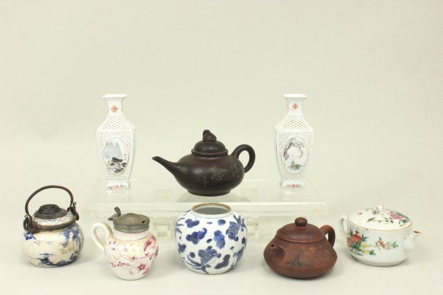 Including 2 clay teapots, 2 porcelain teapots, antique covered pot, vase with missing cover, and pair open reticulated vases.