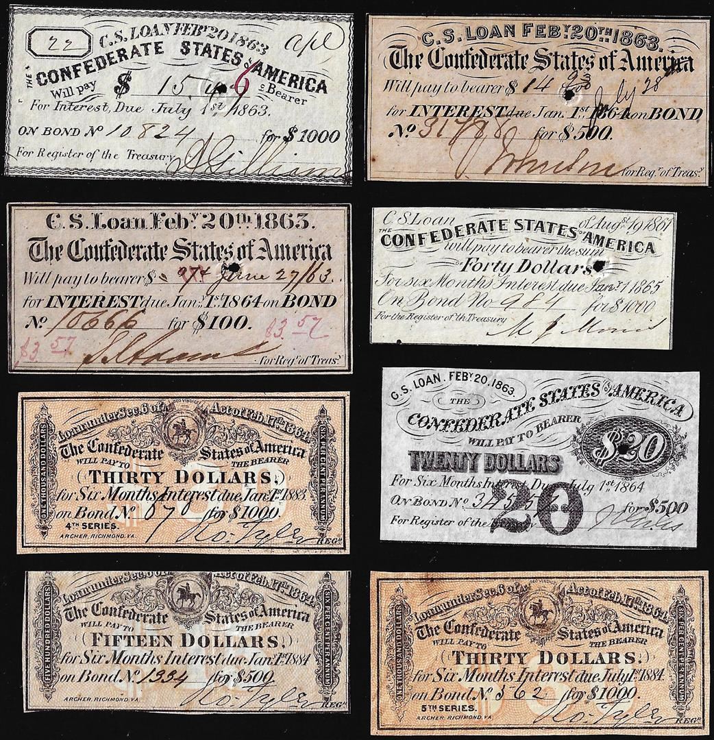 Lot of (8) Assorted 1861-1864 Confederate States of America Bond Coupons