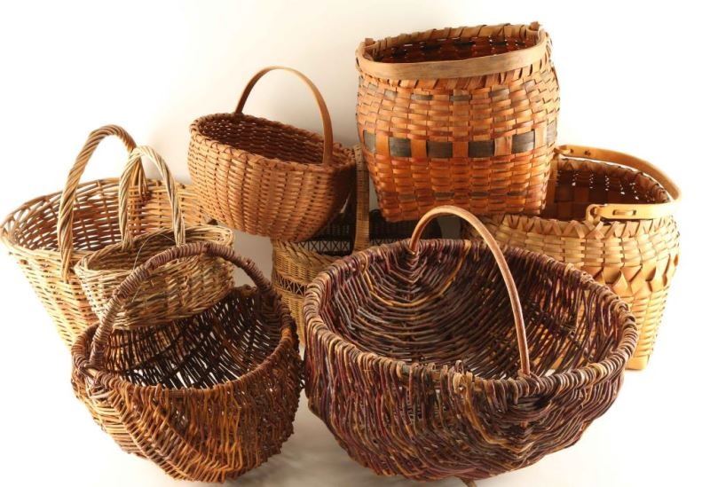 Including; North Midwestern loosely woven grapevine basket with handle 11 1/2"x11 1/2", oval woven basket with handle 8 1/2"x3 3/4"x8 1/2", round woven basket with handle 10 1/4"x9", twig body with handle 16 1/2"x 14 3/4"x14"-melon style, square basket with handle 12 1/2"x8 3/4", wood woven basket with handle 12 1/2"x13 1/2", wicker basket with handle 10"x8"x12", split oak basket with handle 10 "x13". Nice assortment