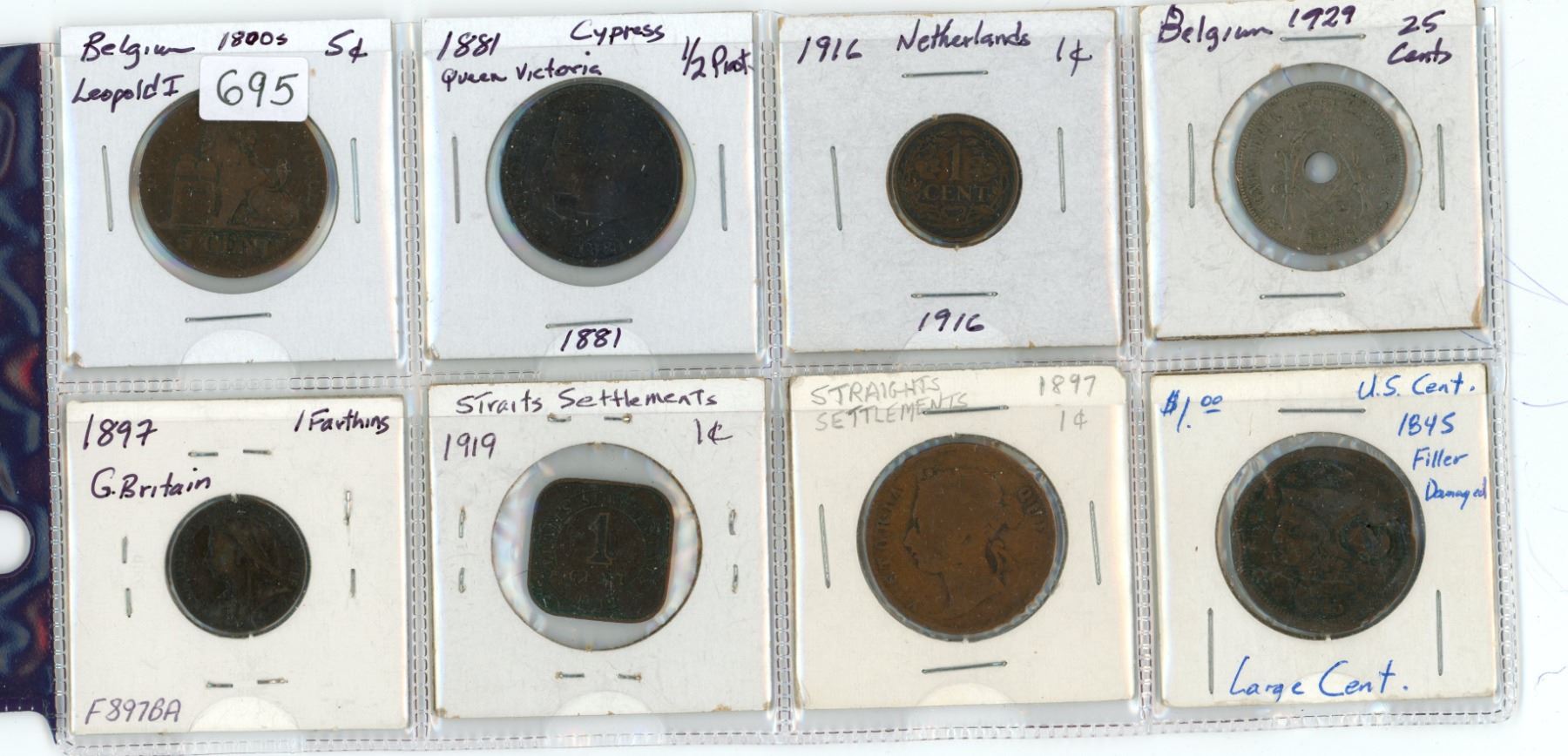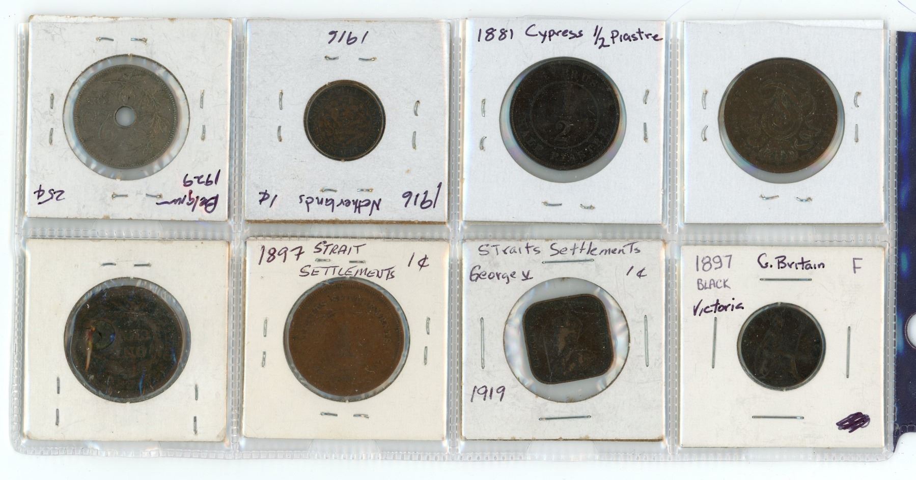 Lot of 8: Belgium (1800s) 5c & (1929)25c; Cypress(1881)1/2p; Britain (1897) 1F; Straits settlements (1897 &1919( 1c; US 1845 $1