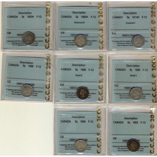 Lot of 8 CCCS F-12 graded Five Cents; 1874H Cross., 1880H Obv#3, 1883H, 1885 Sm.5, 1886 Sm.6, 1889, 1893, 1899