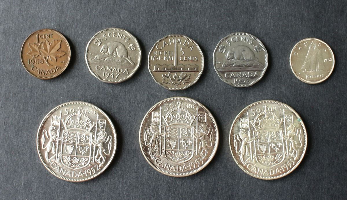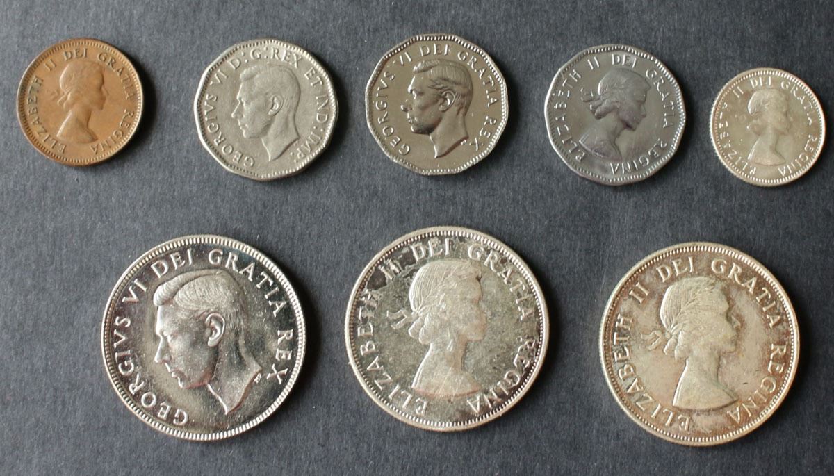 Included are 8 Canadian Coins, 1953 One Cent, 1947 Dot Five Cents, 1951 COMM 5 Cents, 1953 5 Cents, 1953 10 Cents, 1952 50 Cents, 1953 50 Cents. Fine to Uncirculated. Lot should be viewed. No Returns