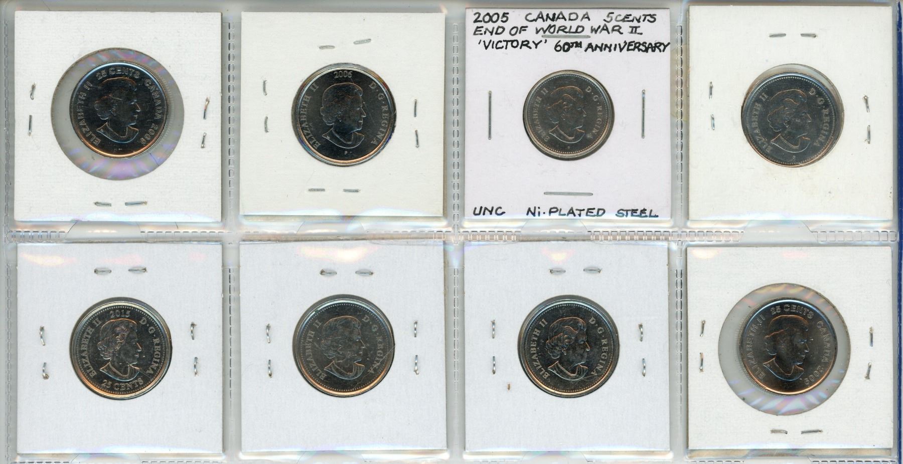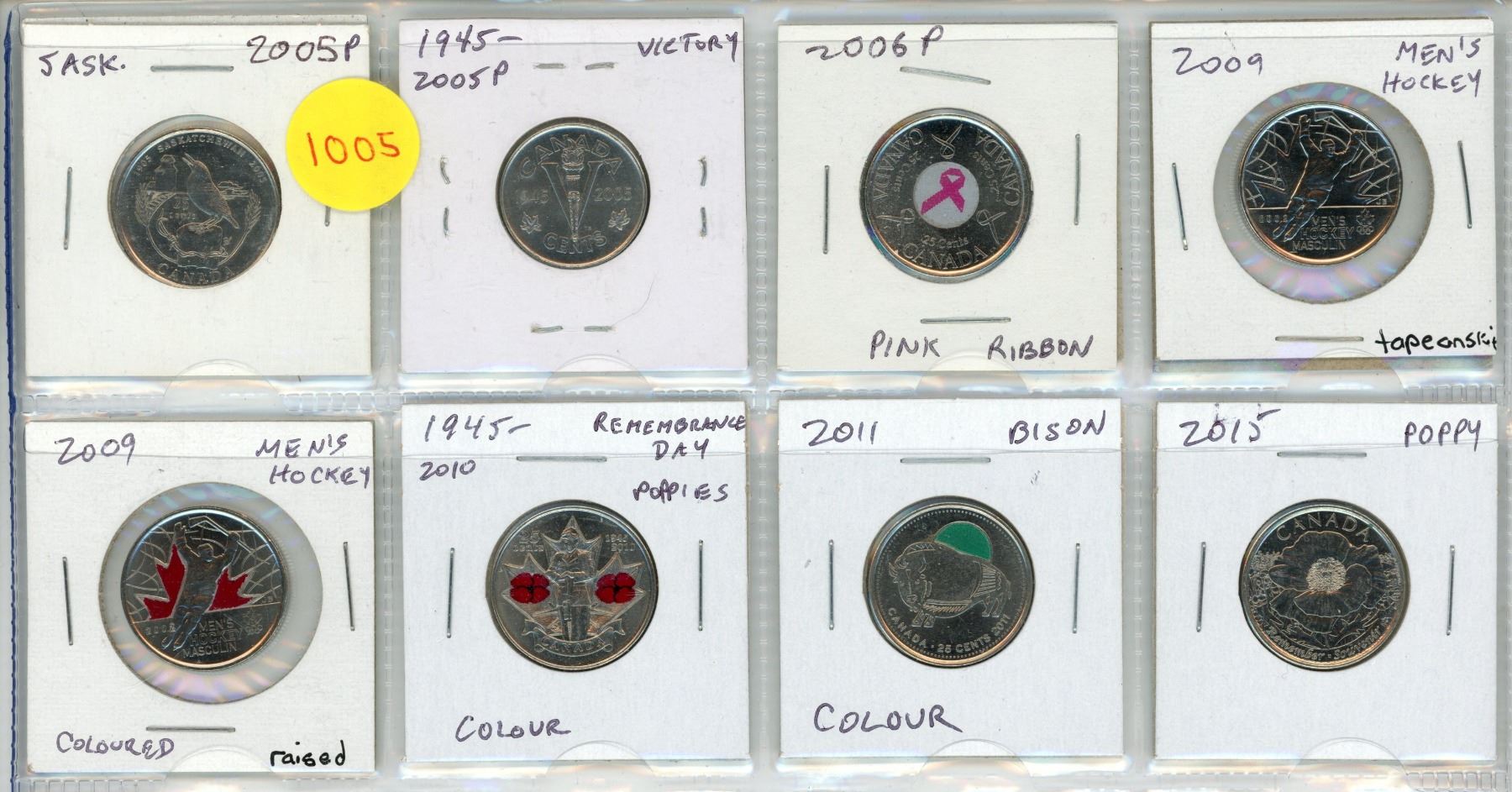 Lot of 8 Canadian Commemorative 25 Cents, including 4 Colourized coins. BU.
