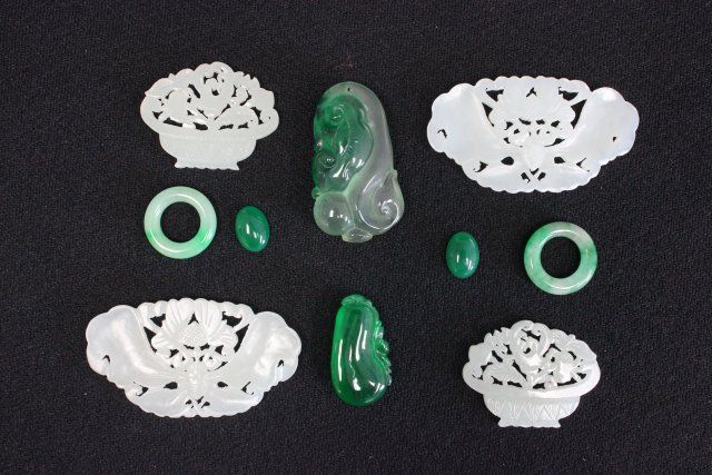 Including: 4 white jade pendants, jade 'Vegetable,' jade 'Flower,' 2 jade band rings and 2 jade oval stones.