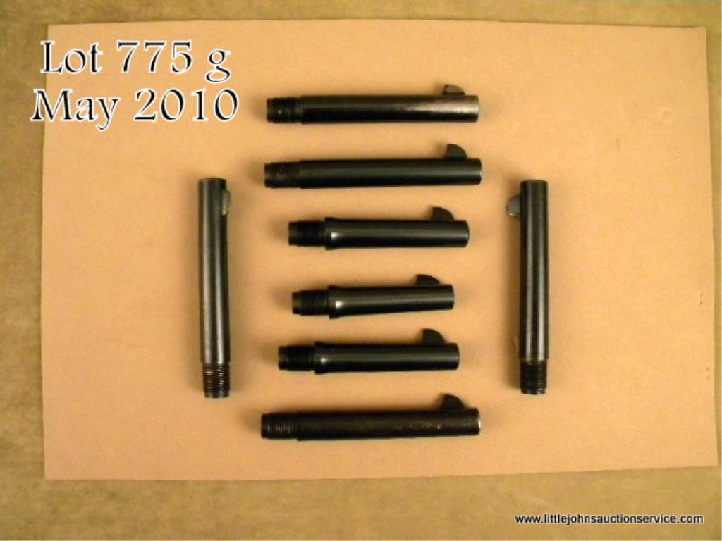 Lot of 8 Colt New Service DA revolver barrels, all blued and ranging in barrel lengths from 4” to 5-1/2”, all in good to very good condition and in .357, .38 WCF and .455 Eley calibers, most with very good bores. A great small New Service lot.Est.: $300-$600.