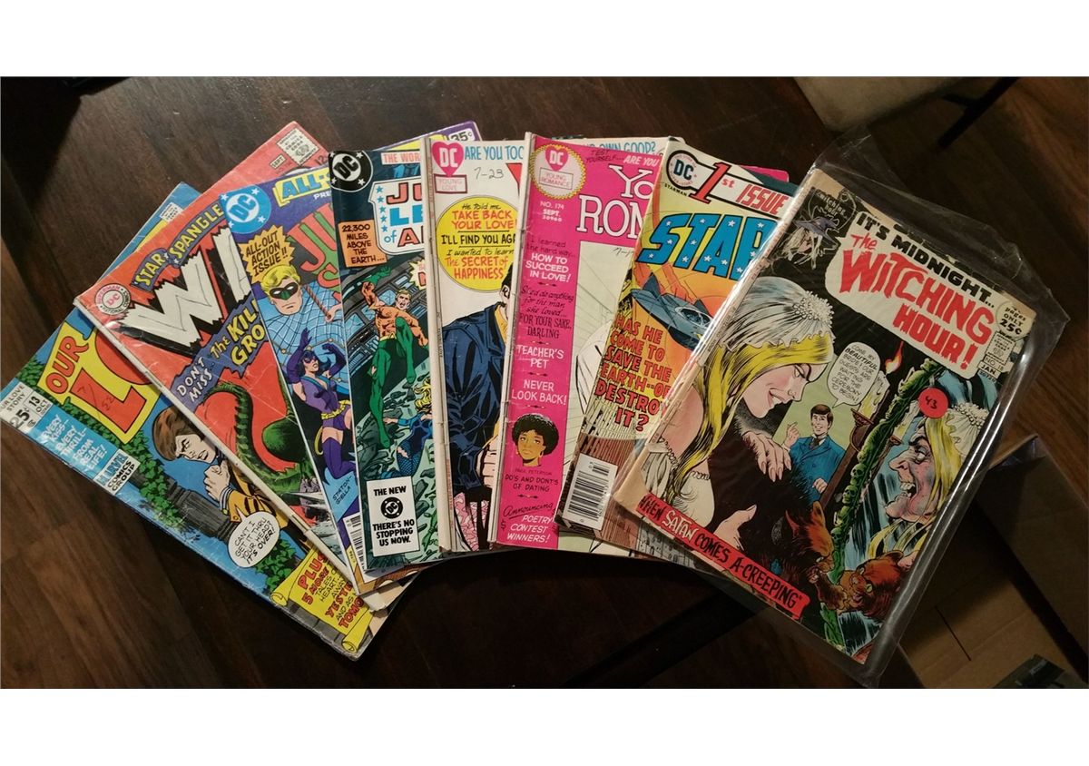 Here we have (8) different comics, the withching hour #18, starman #12, young romance #174, young love #88, justice league america #229, justice society #73, star spangled war #134, our love story #13. All showing wear & tear.