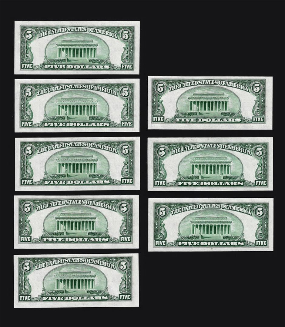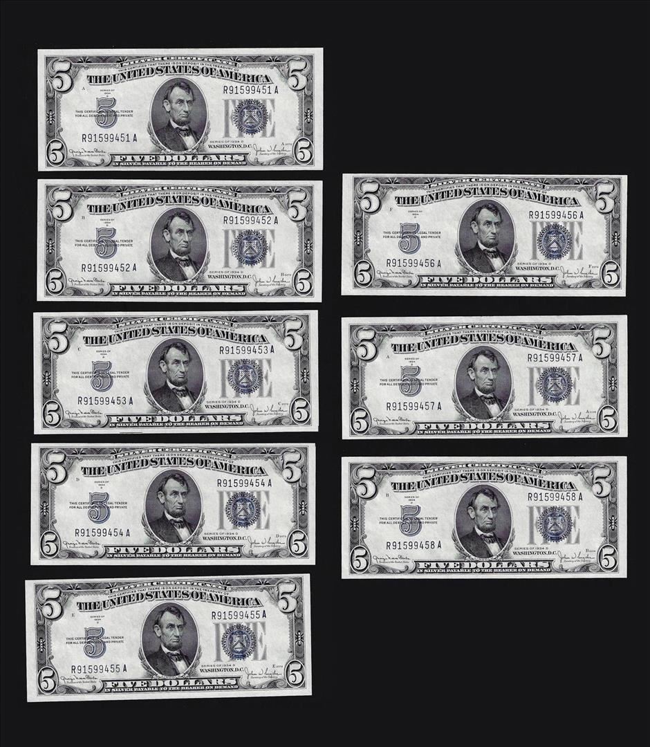 One Lot of (8) Consecutive 1934D $5 Silver Certificate Notes.