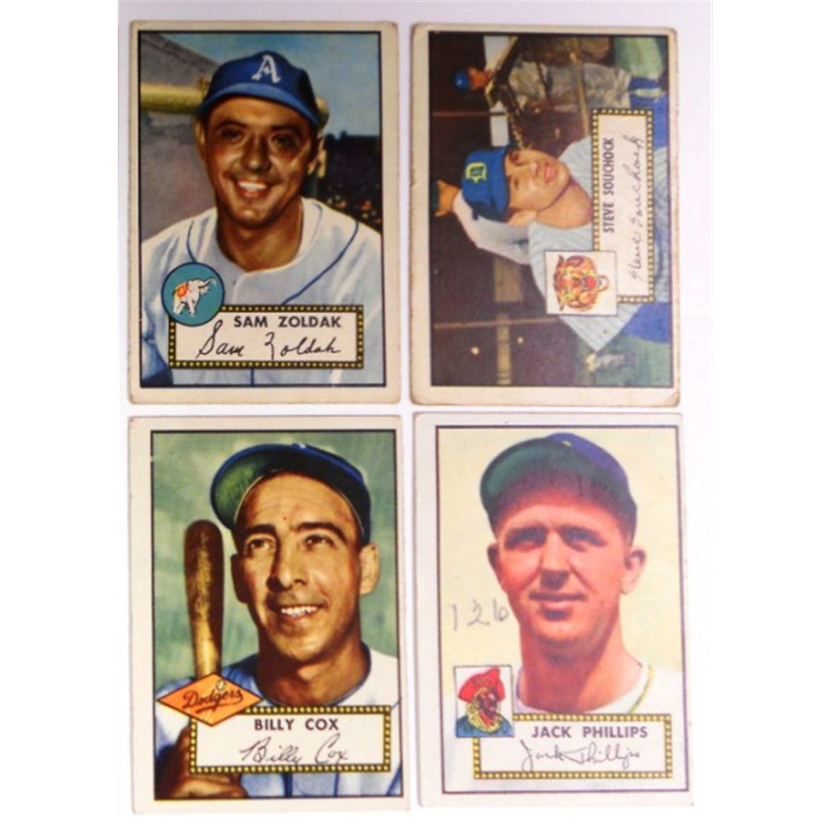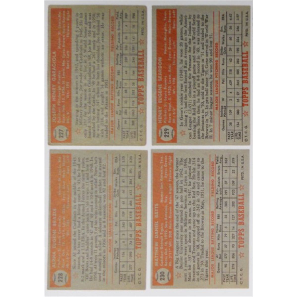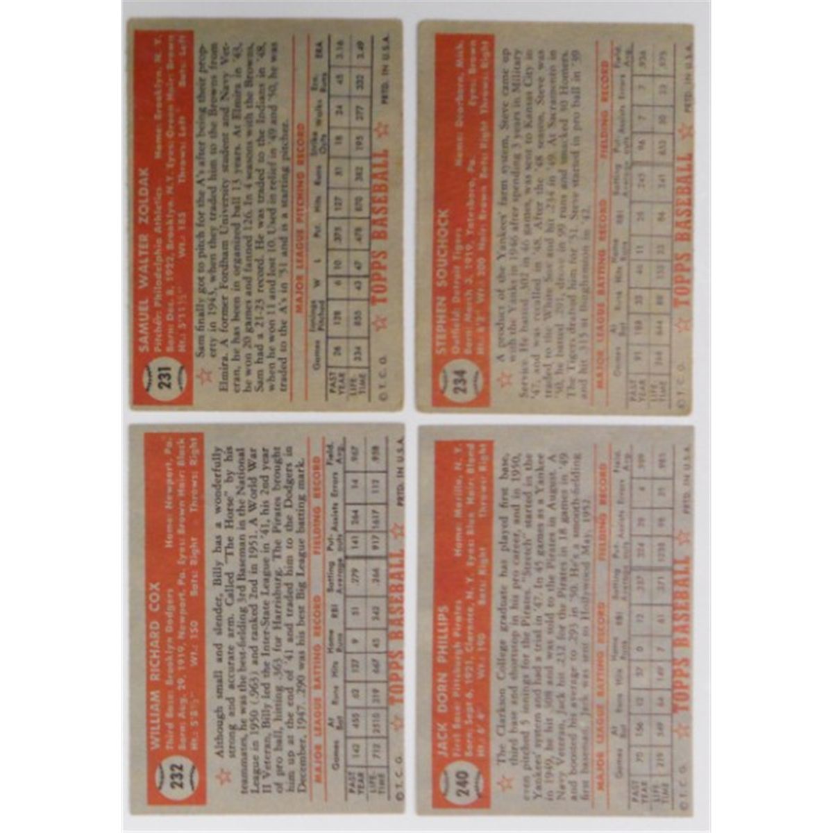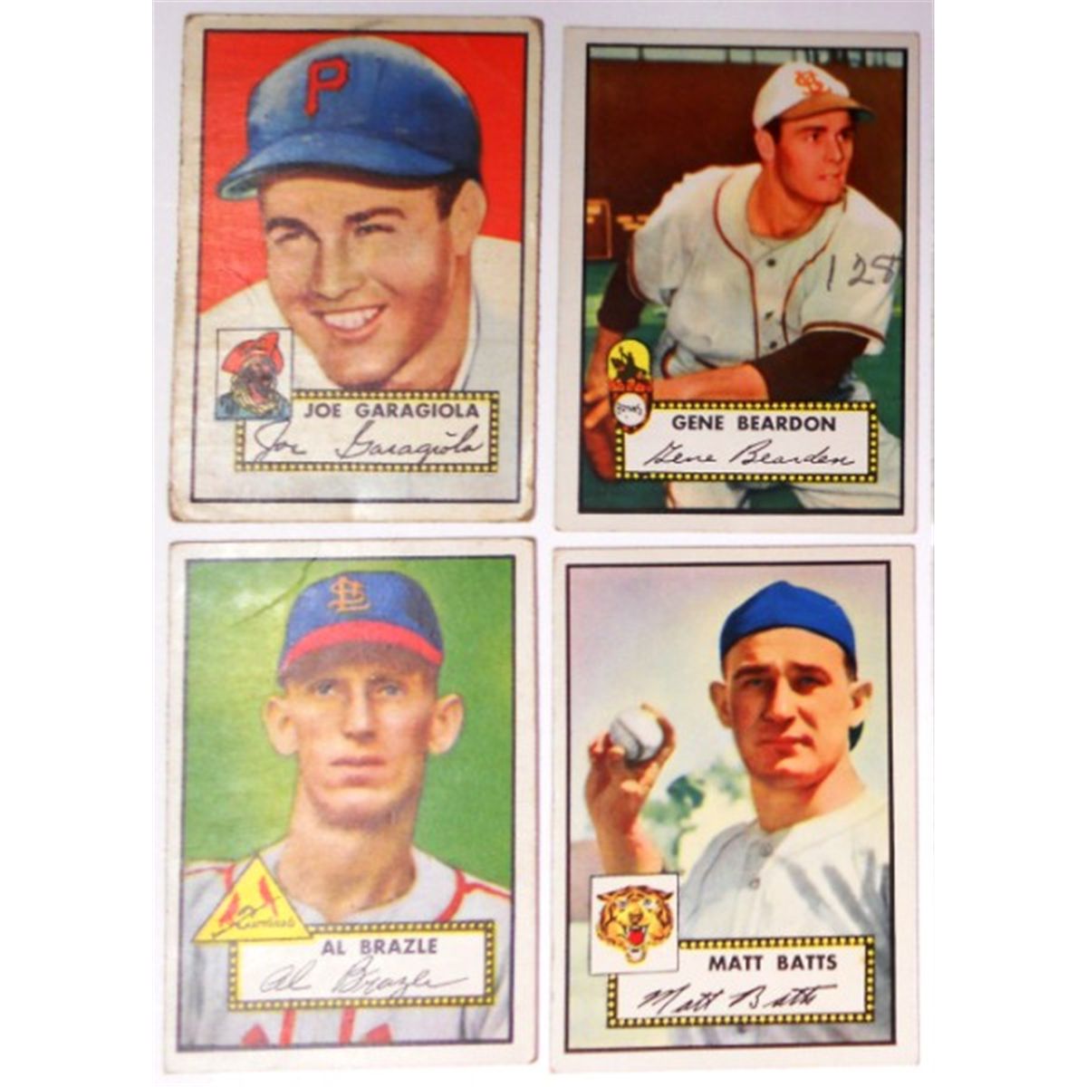 These 1952 tops cards are from what is considered the most innovative set of baseball cards of its day. The backs are numbered and have the player's vitals. You are bidding on all eight cards as a single lot they are #227 Joe Garagiola - #228 Al Brazle [top left corner bent]- #229 Gene Beardon - #230 Matt Batts - #231 Sam Zoldak - #232 Billy Cox - #234 Steve Souchock & #240 Jack Phillips [126 in pencil on front]. Please see the pictures provided as these are the cards that you will receive. We strive to take the most accurate photos of our items because we believe grading is very subjective. That is why we leave the final determination of the condition and grade of the cards to you.