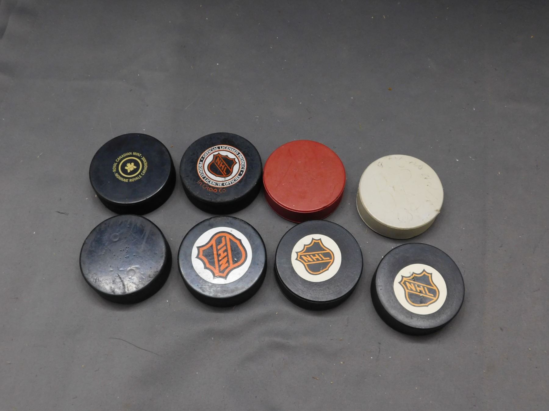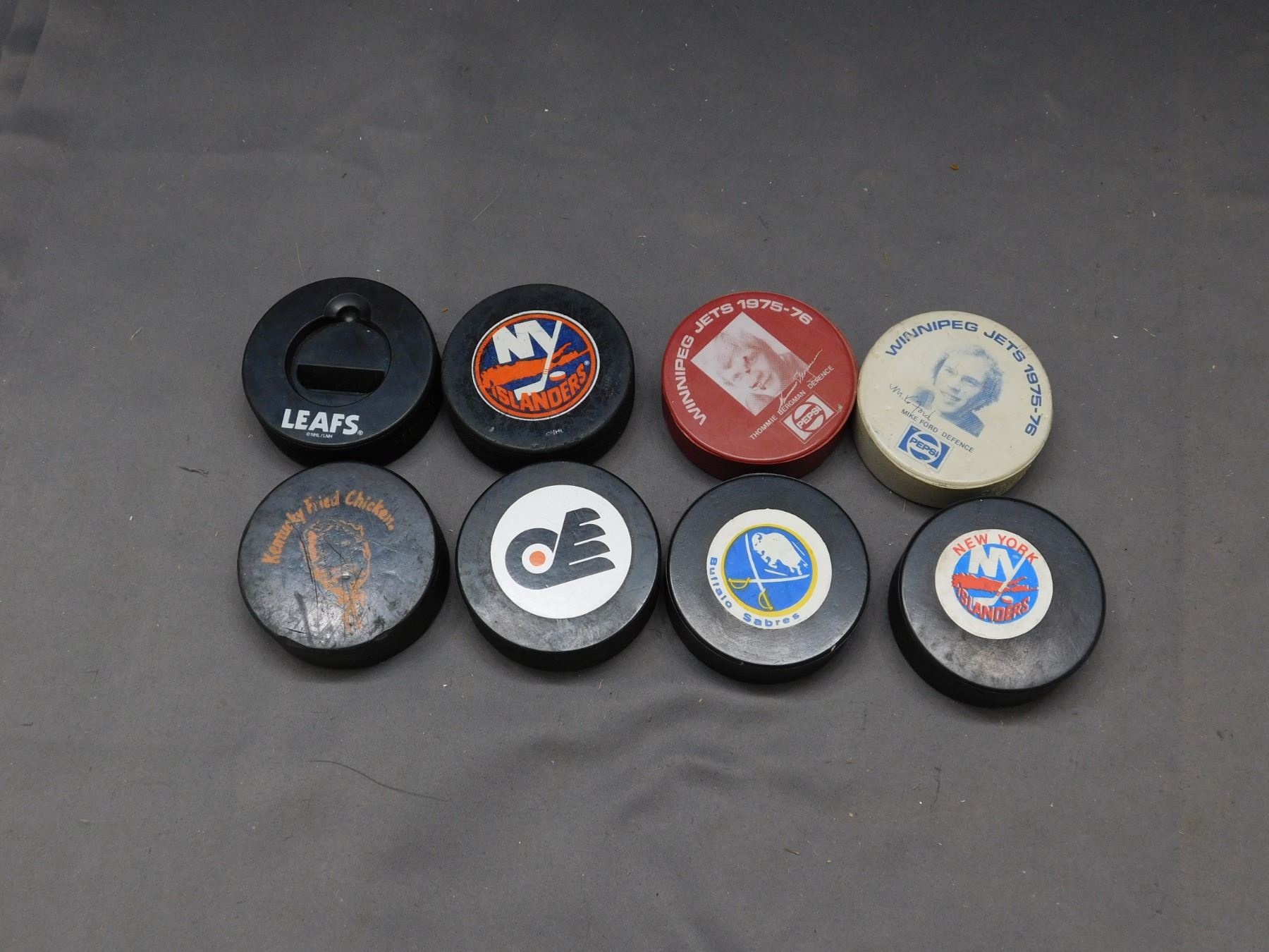 Lot of 8 Hockey Pucks Jets, Islanders, Leafs, Buffalo Sabres, KFC