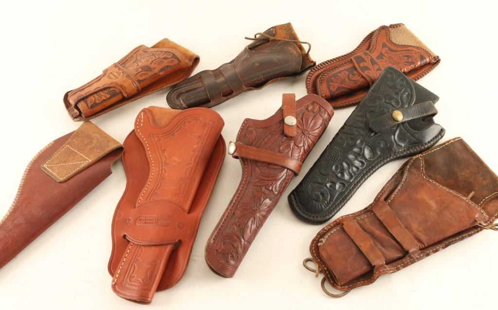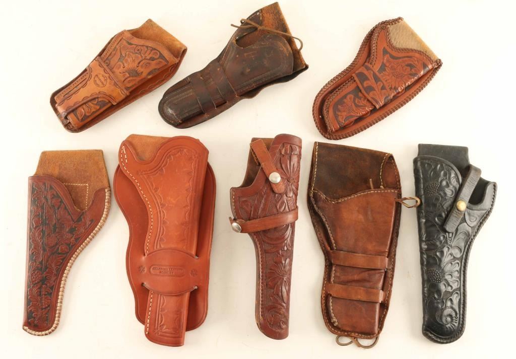 Including a Wolf Brand Single Loop Holster, Oklahoma Leather Company single loop long barreled revolver holster, 2 vintage double loop holsters, black tooled Laurence lefty holster.