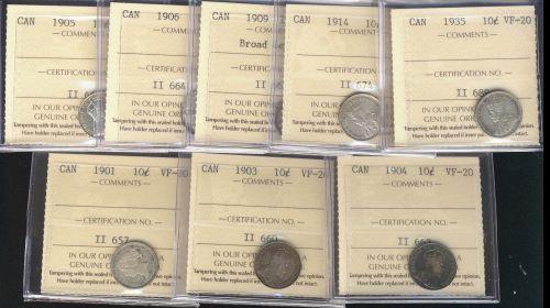 Lot of 8 ICCS graded Ten cents;1901, 1903, 1904, 1905, 1906, 1909 BL, 1914, 1935. All VF20 except the 1906 which is VF30.