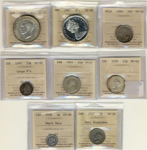 Lot of 8 ICCS graded pieces including 1858 SD 5¢ VF30, 1947 Dot 5¢ VF20 scrts., 1899 Lg 9 10¢ VF20, 1921 25¢ F15, 1939 25¢ MS60, 1938 $1 EF40, 1967 SP66 Heavy Cameo Nf 1888 20¢ VF20. A very interesting and attractive lot. Should be viewed!